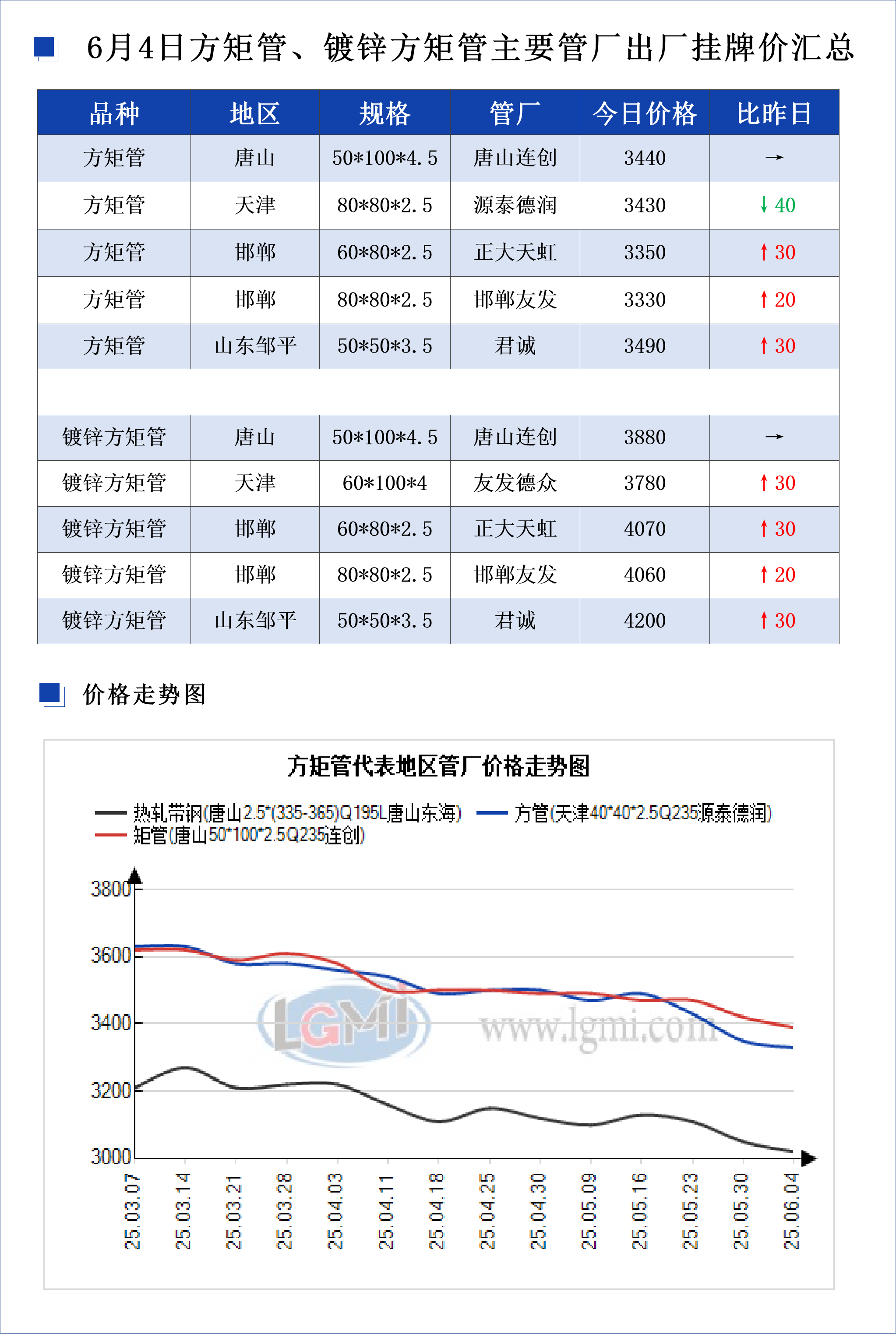 • 6月4日方矩管、镀锌方矩管主要管厂出厂挂牌价汇总