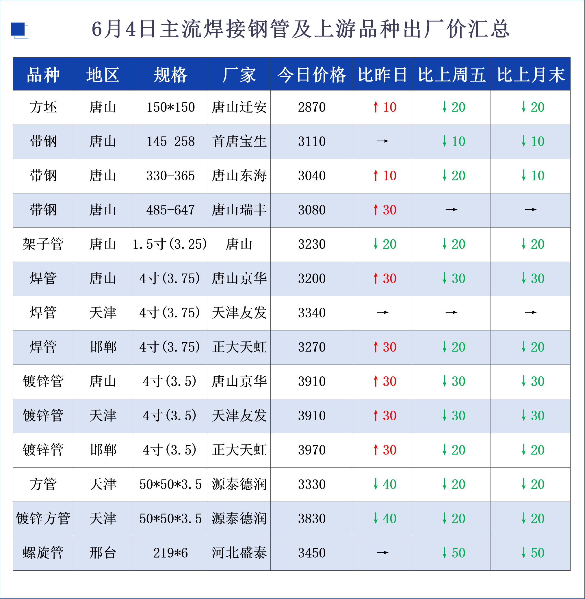 • 6月4日主流焊接钢管及上游品种出厂价汇总
