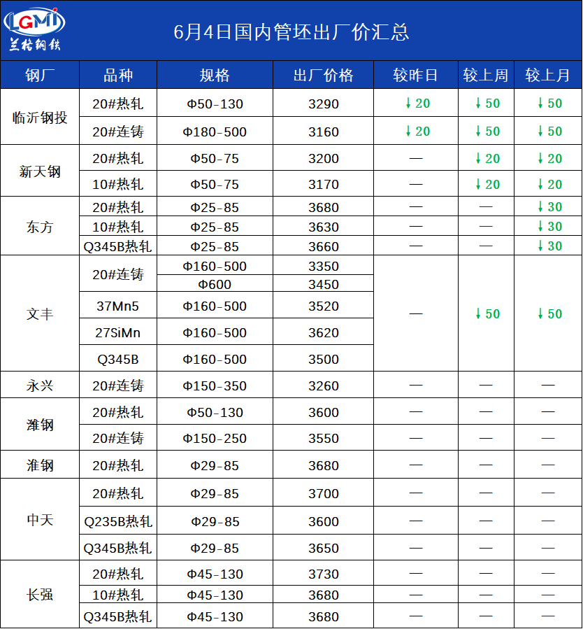 • 6月4日主导钢厂20#热轧管坯出厂价(11:00)