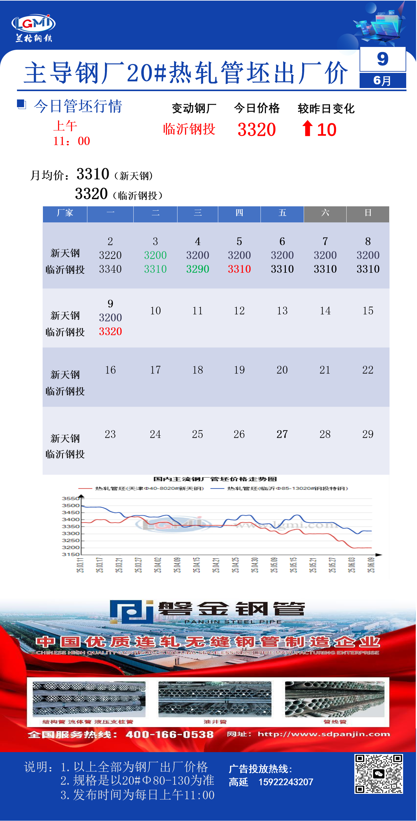 • 6月9日主导钢厂20#热轧管坯出厂价(11:00)