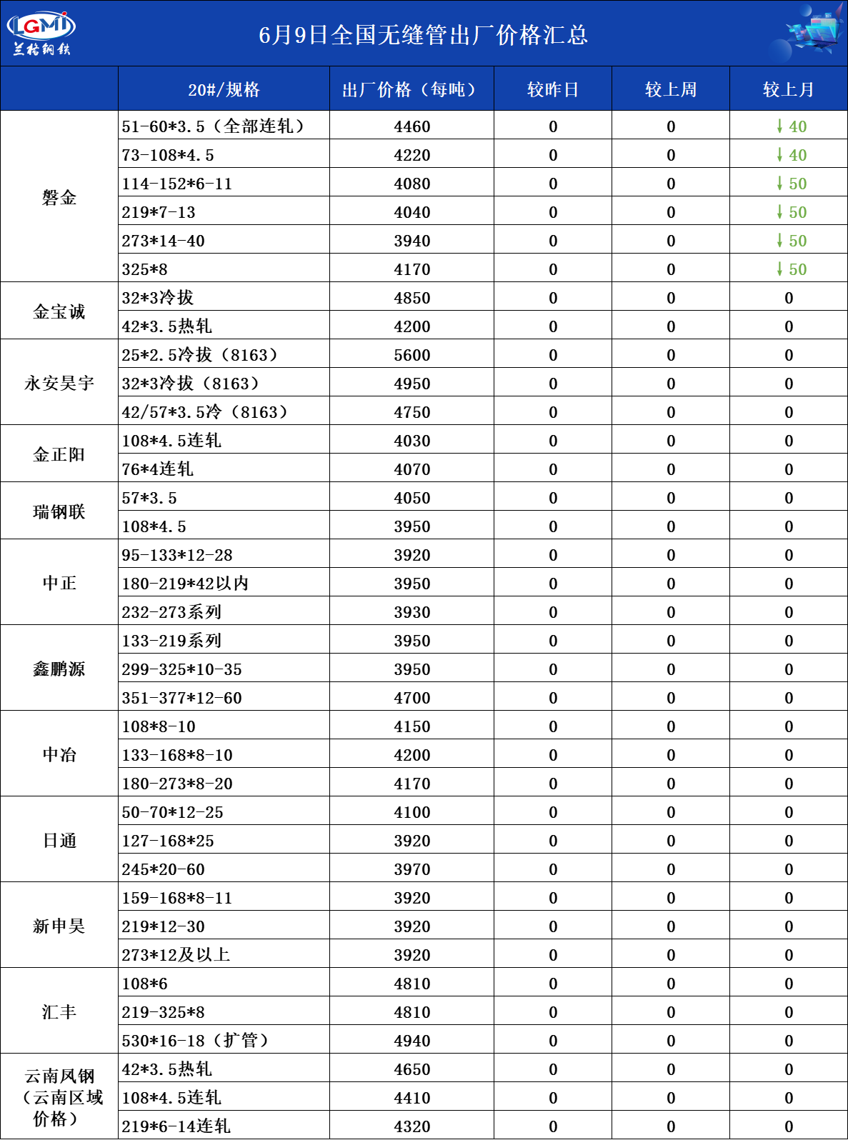 • 6月9日主导钢厂20#热轧管坯出厂价(11:00)