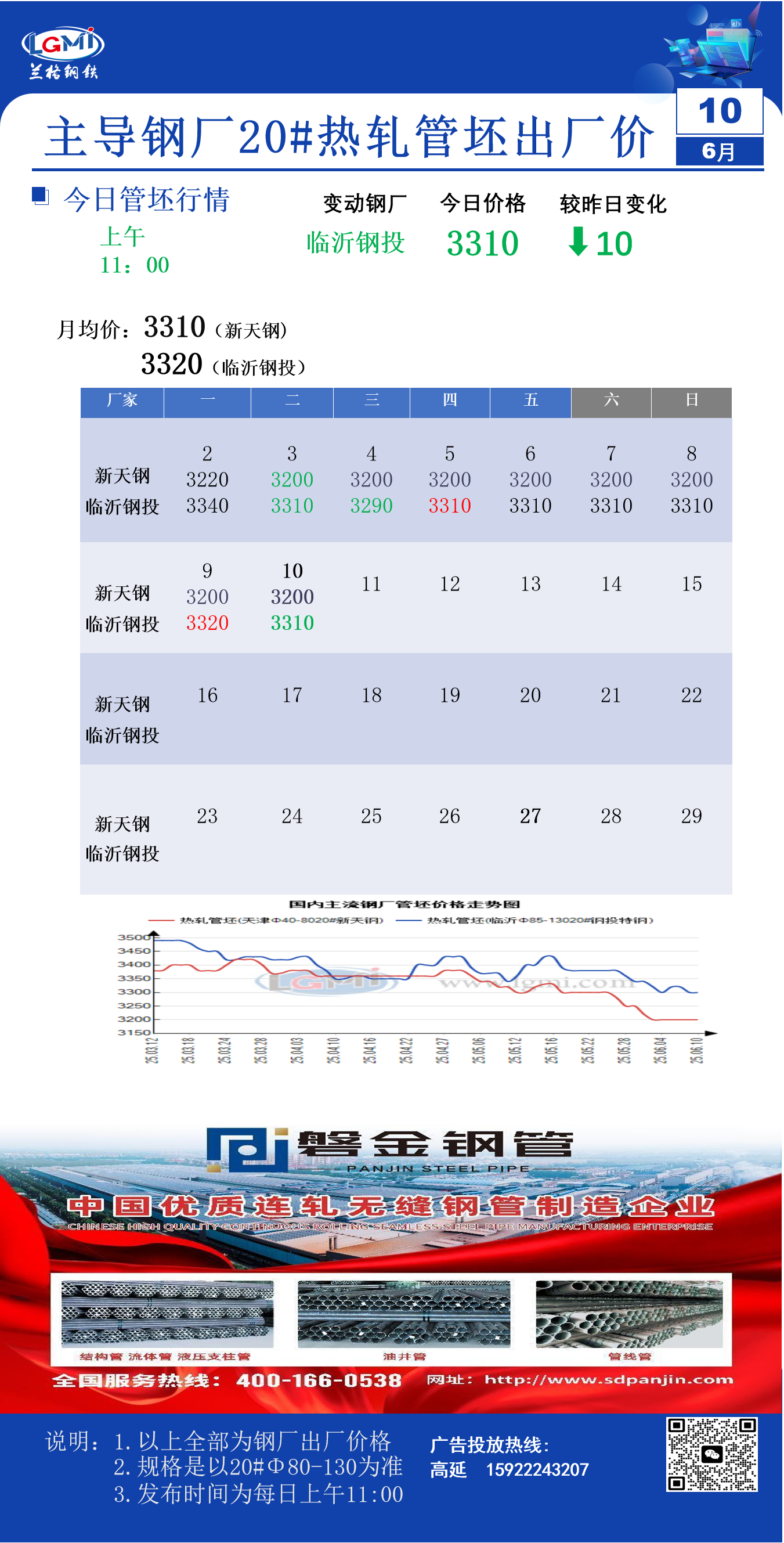 6月10日主导钢厂20#热轧管坯出厂价(11:00)