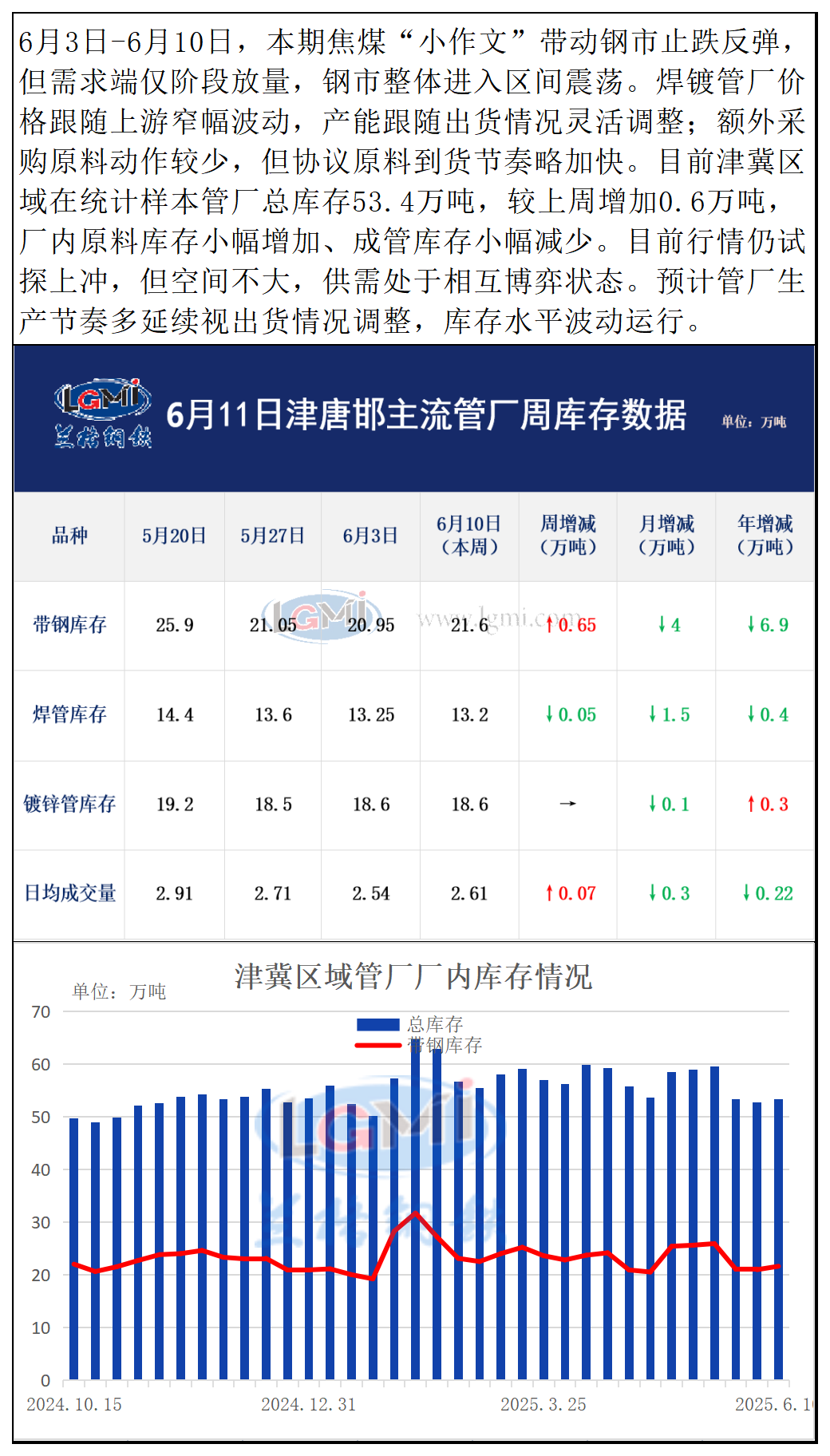 • 兰格调研:天津唐山邯郸11家主流管厂库存数据统计(6月11日)