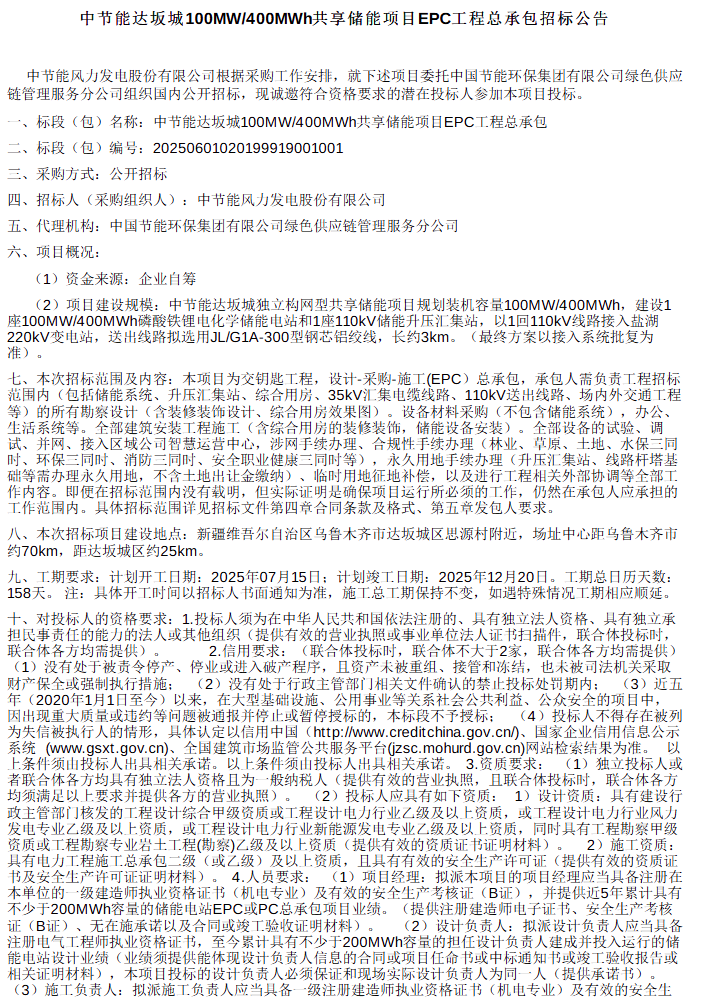 中节能达坂城100MW/400MWh共享储能项目EPC工程总承包招标公告发布,招标人为中节能风力发电股份有限公司,位于新疆维吾尔自治区乌鲁木齐市达坂城区思源村附近。