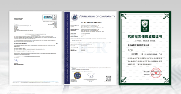 “雨虹管”在选材、工艺、强度、标准上都对标世界水平,雨虹PP-R管道全系列产品通过CIAA抗菌标准认证,同时获得了英国WRAS、欧盟CE等国际权威用水安全认证。国际权威用水安全认证,为“雨虹管 安全与世界同步”背书。