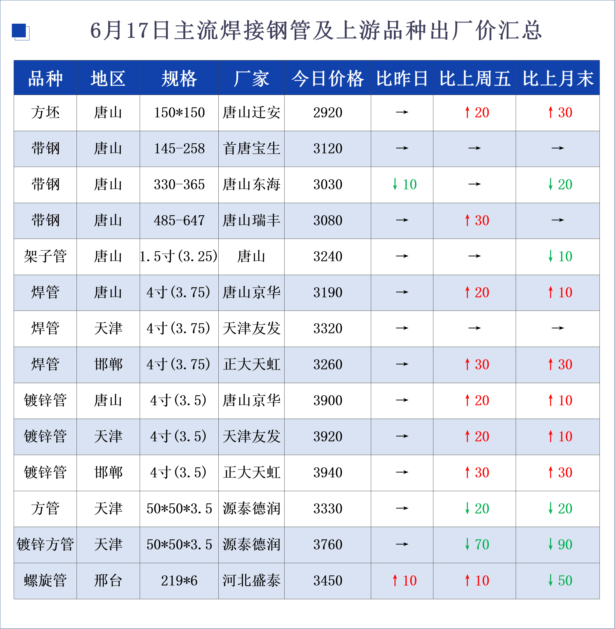 • 6月17日主流焊接钢管及上游品种出厂价汇总