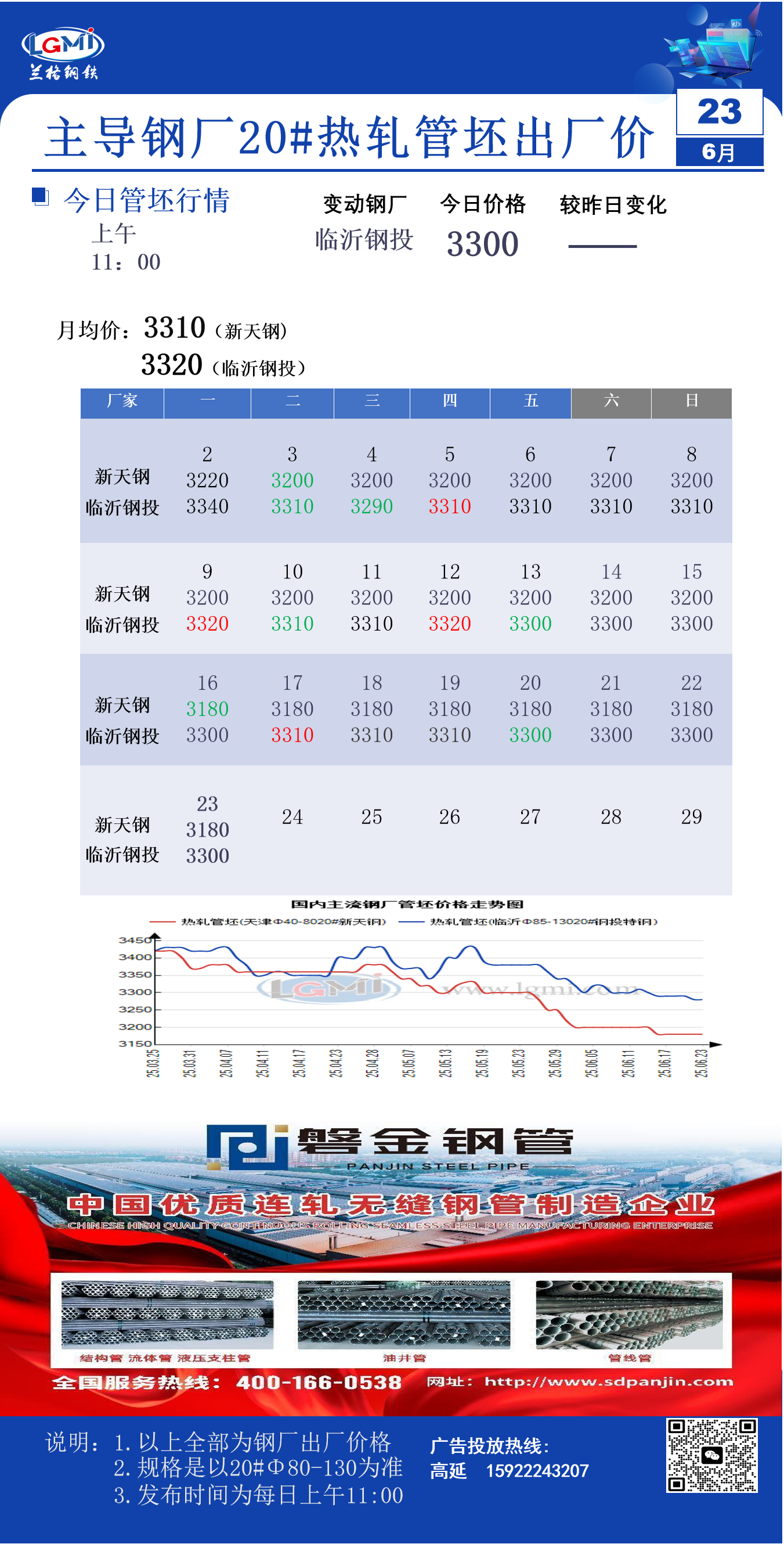 • 6月23日主导钢厂20#热轧管坯出厂价(11:00)