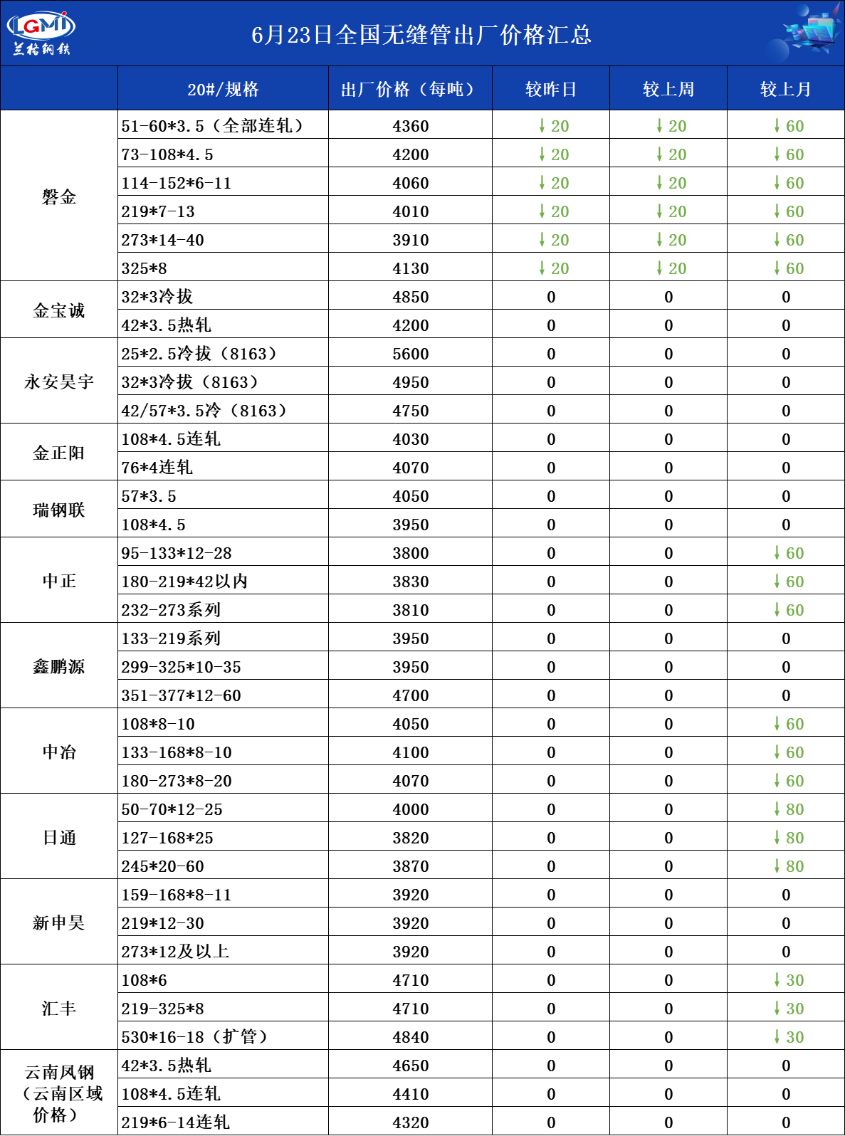 • 6月23日主导钢厂20#热轧管坯出厂价(11:00)