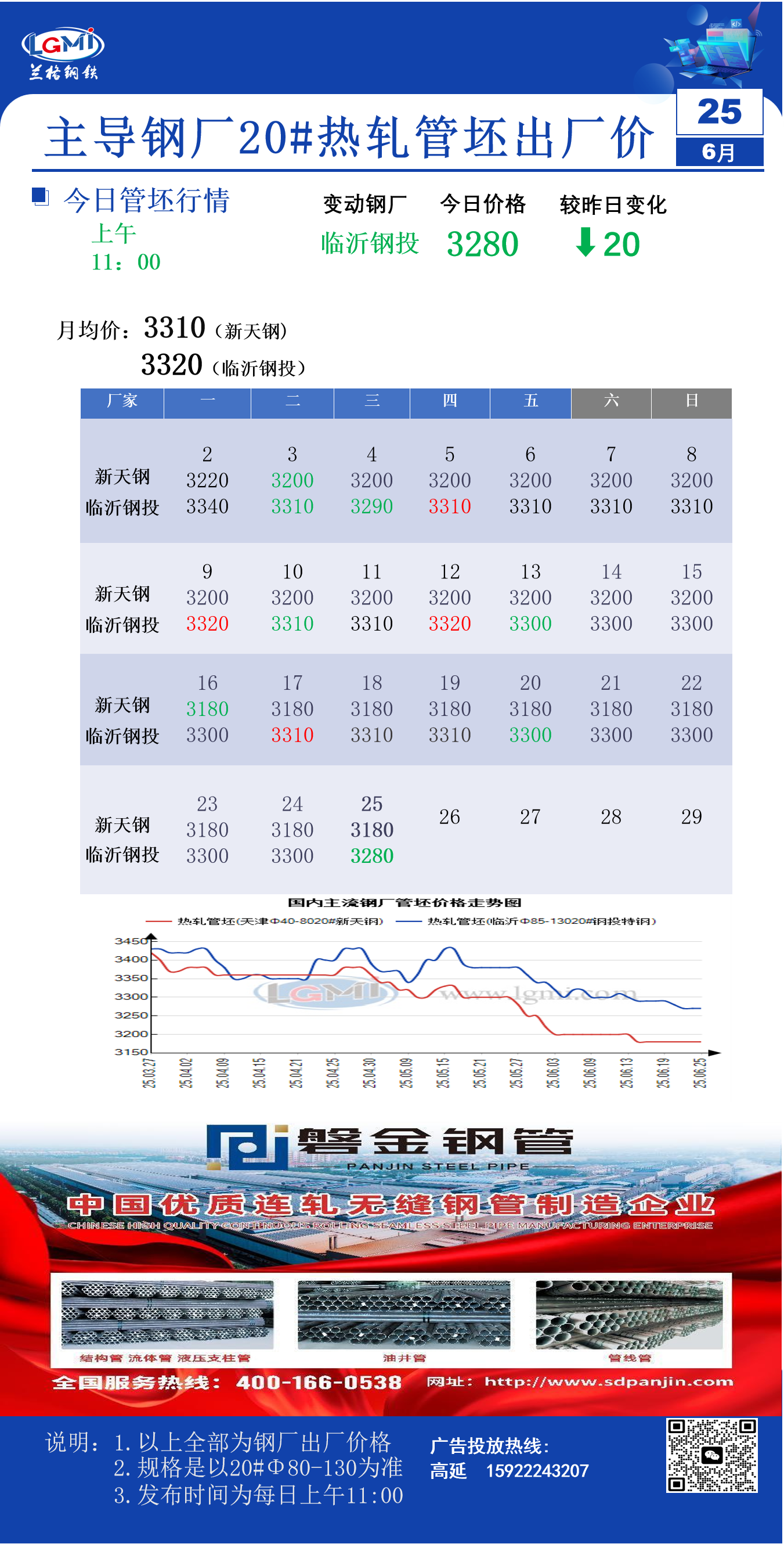6月25日主导钢厂20#热轧管坯出厂价(11:00)