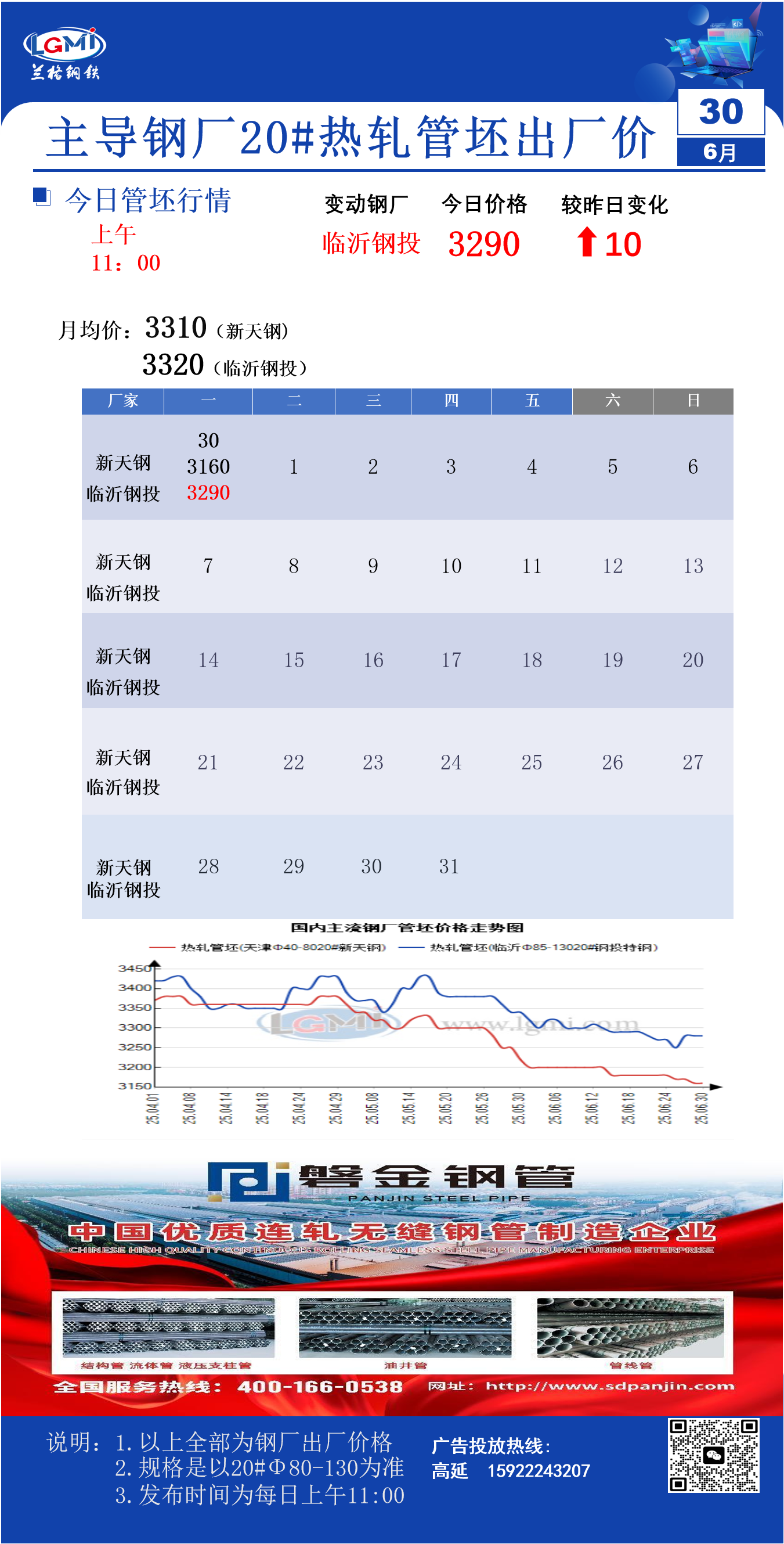 6月30日主导钢厂20#热轧管坯出厂价(11:00)