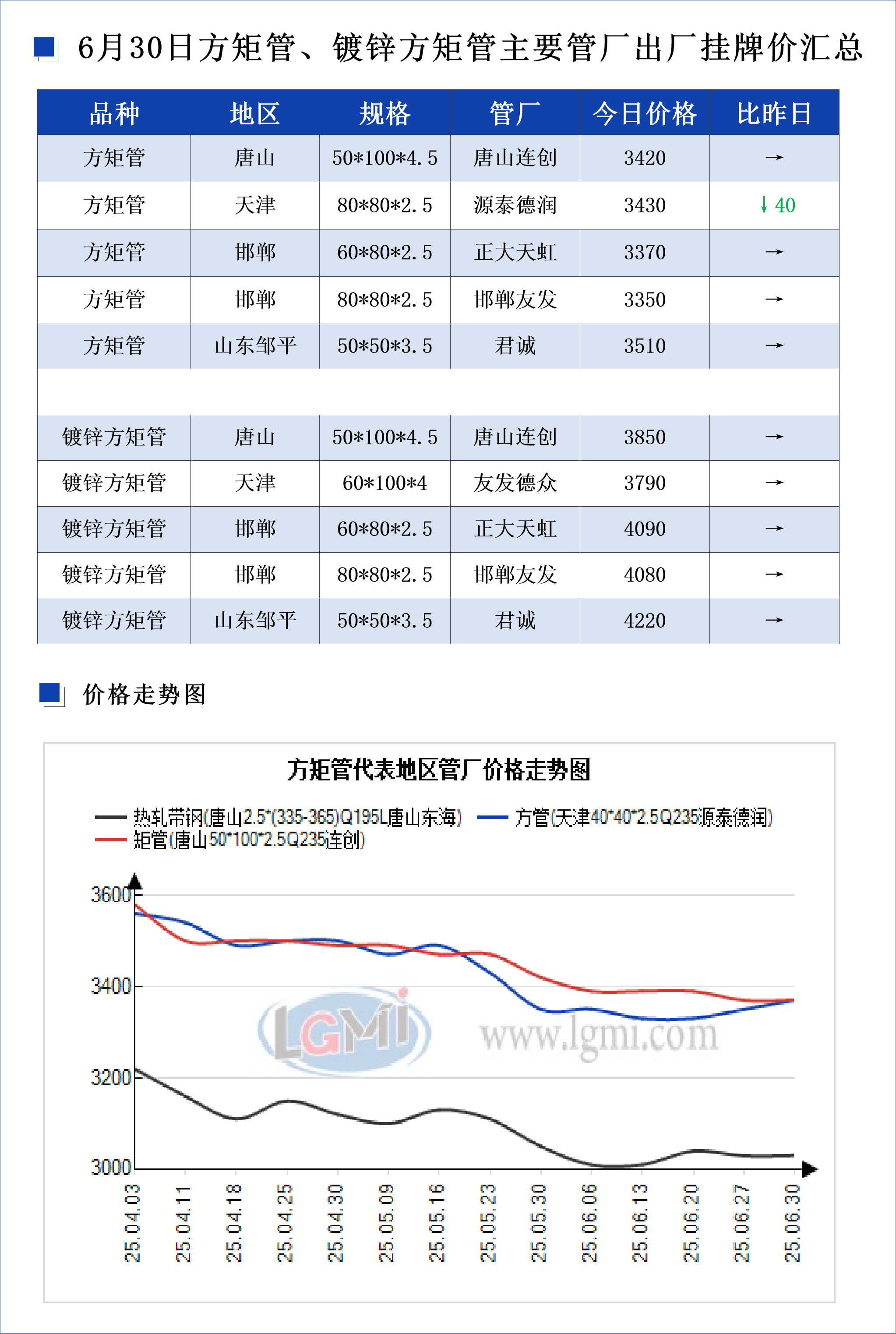 • 6月30日方矩管、镀锌方矩管主要管厂出厂挂牌价汇总