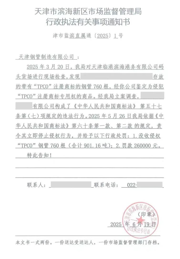 滨海新区市场监督管理局经各方调查后固定证据并认定责任人,依法对长沙安格达公司作出没收全部侵权钢管、罚款26万元等处罚,并将沧州北钢违法线索移交沧州市市场监管部门。 天津钢管将对各类侵权行为始终保持“零容忍”态度,呼吁合作伙伴通过正规渠道采购产品,共同维护健康有序的市场环境。 |