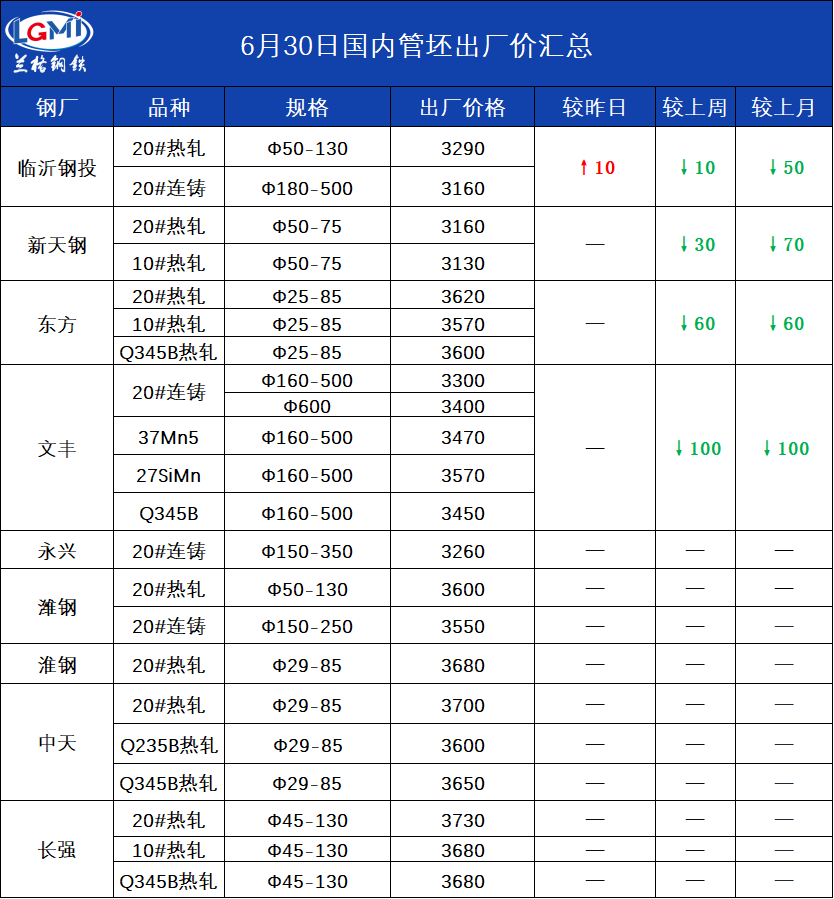 • 6月30日主导钢厂20#热轧管坯出厂价(11:00)