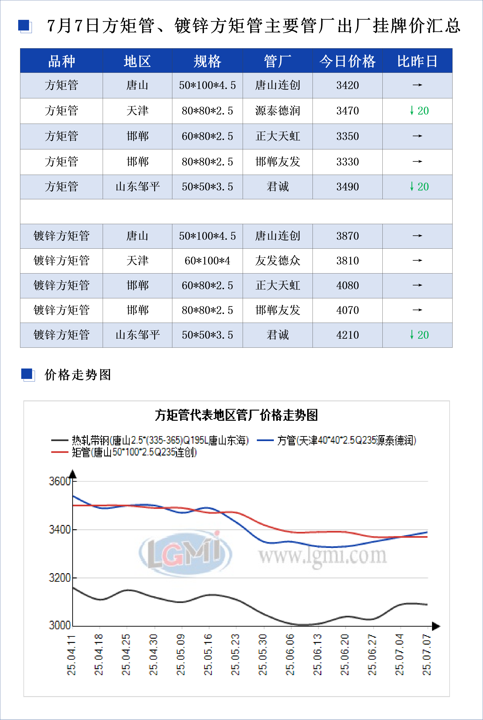 • 7月7日方矩管、镀锌方矩管主要管厂出厂挂牌价汇总