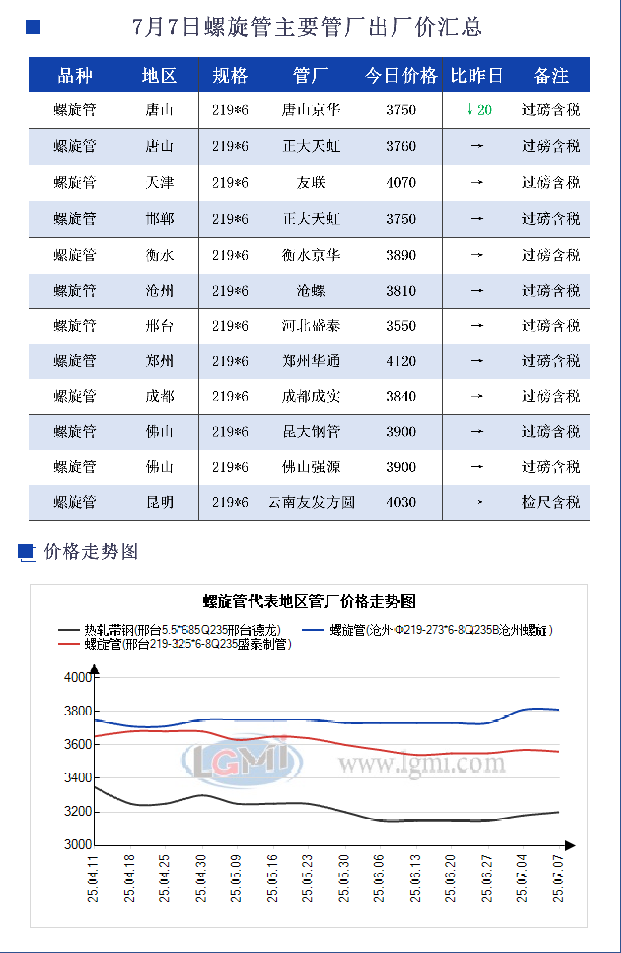 • 7月7日螺旋管主要地区管厂出厂价汇总