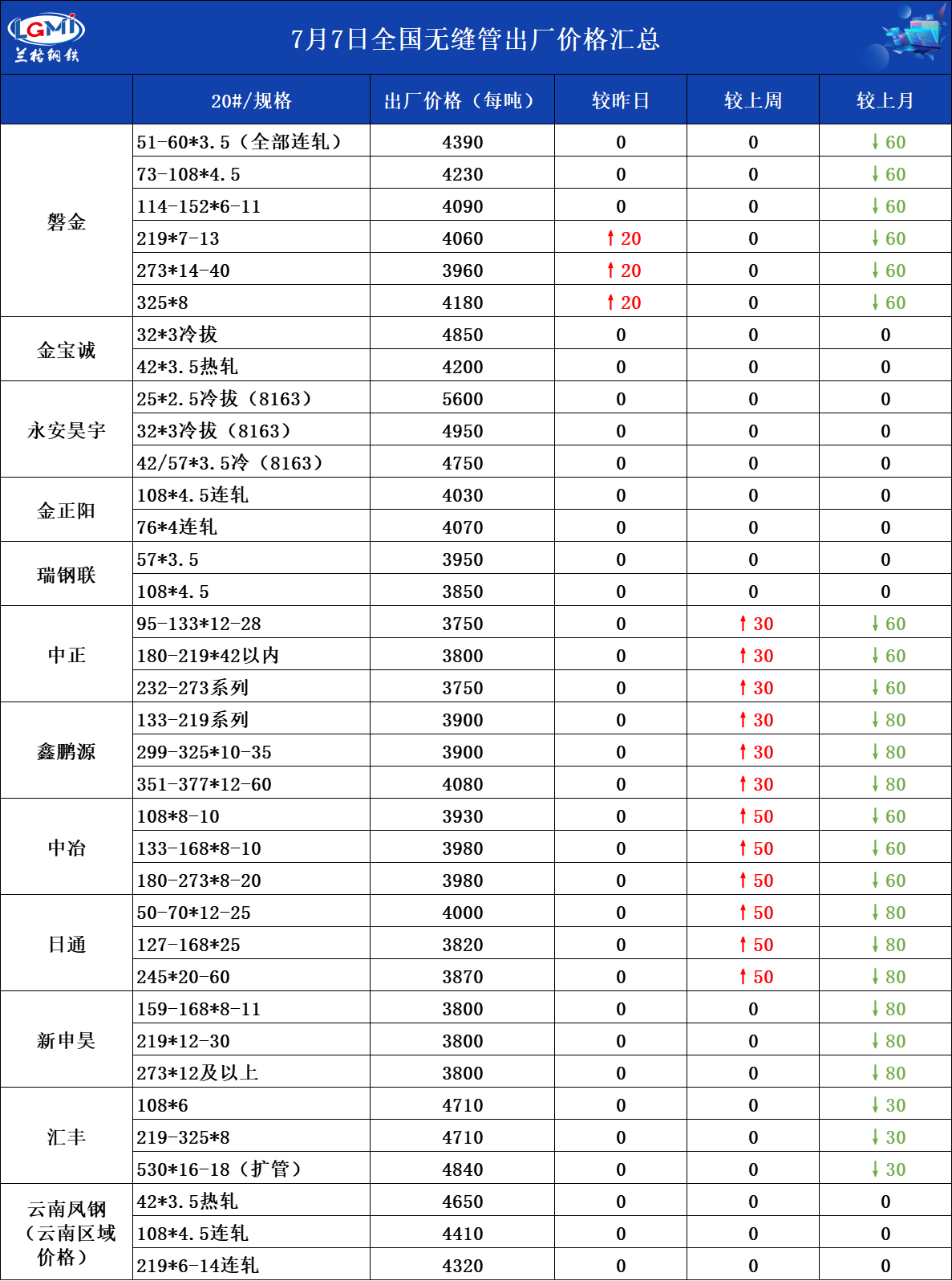 • 7月7日主导钢厂20#热轧管坯出厂价(11:00)