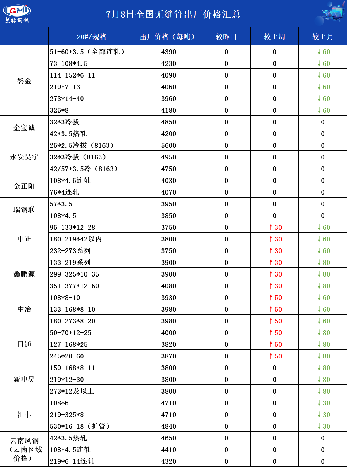 7月8日全国无缝管出厂价格汇总