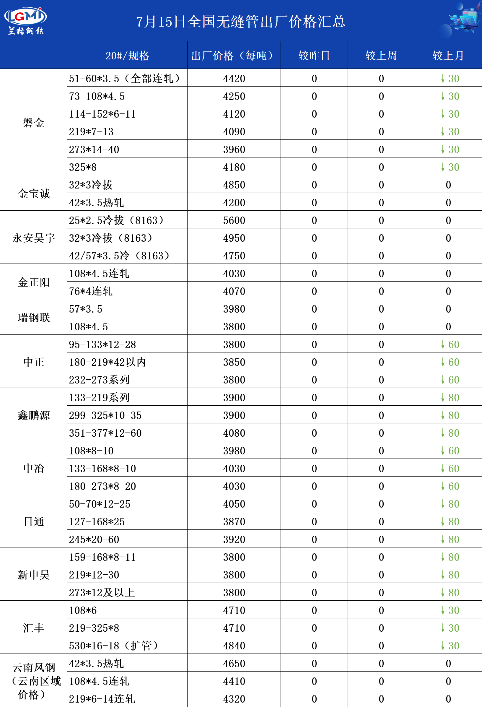 • 7月15日(11:00)主导钢厂20#热轧管坯出厂价