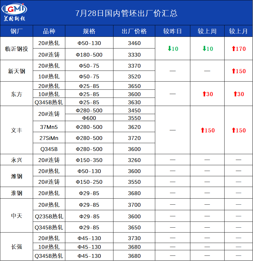• 7月28日(11:00)主导钢厂20#热轧管坯出厂价