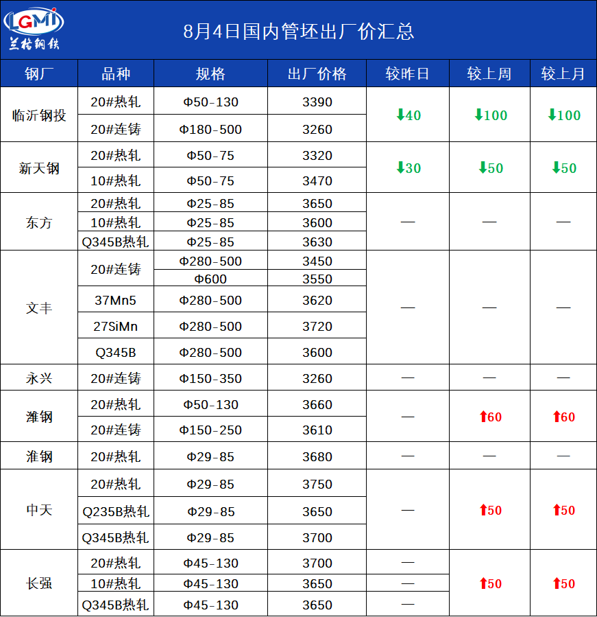 • 8月4日国内管坯出厂价汇总