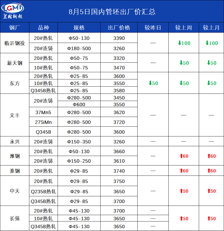• 8月1日(11:00)主导钢厂20#热轧管坯出厂价