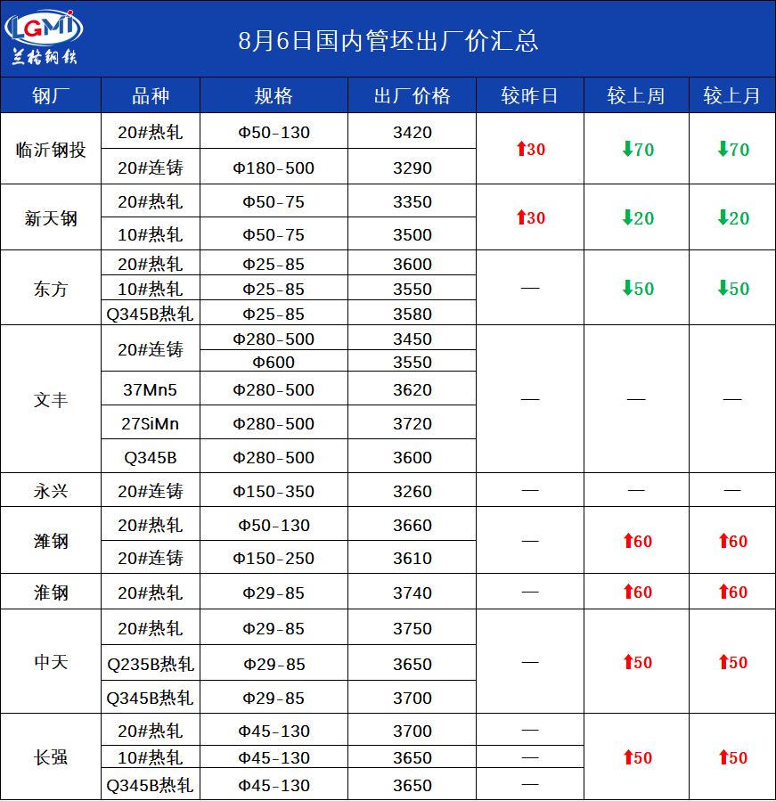 • 8月6日(11:00)主导钢厂20#热轧管坯出厂价
