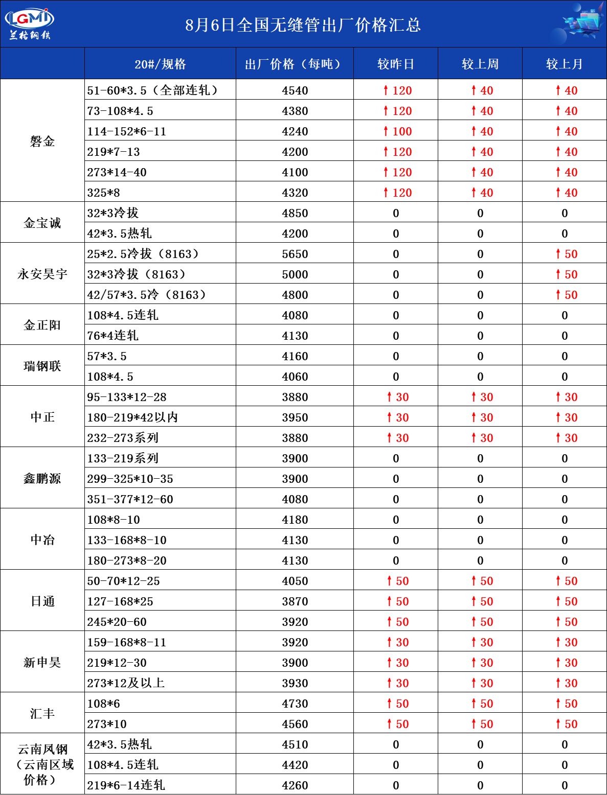 • 8月6日全国无缝管出厂价格汇总