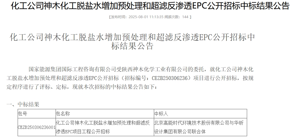 近日,陕西神木化工公司神木化工脱盐水增加预处理和超滤反渗透EPC公开招标中标结果公告。北京高能时代环境技术股份有限公司、华昕设计集团有限公司联合体中标,中标价格:2592.6298万元。