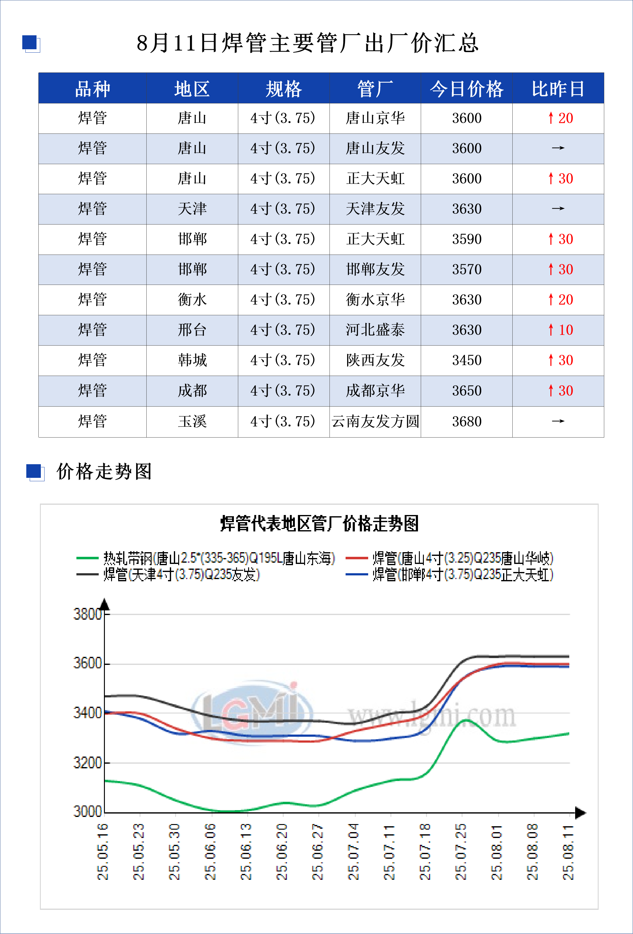 • 8月5日天津市利达钢管集团有限公司出厂价上调30元