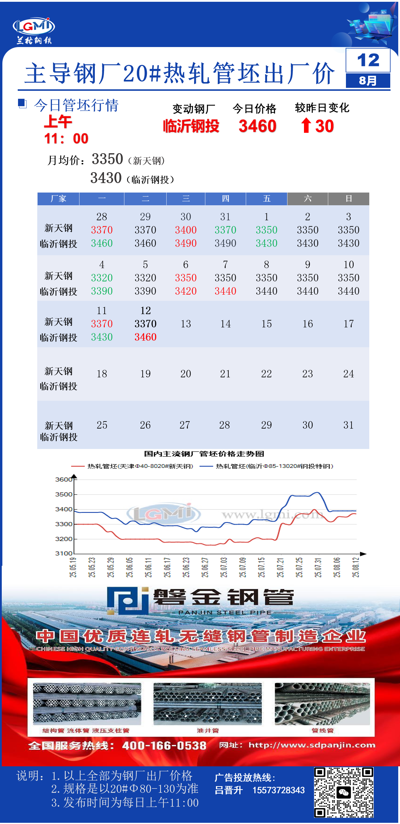 • 8月12日(11:00)主导钢厂20#热轧管坯出厂价