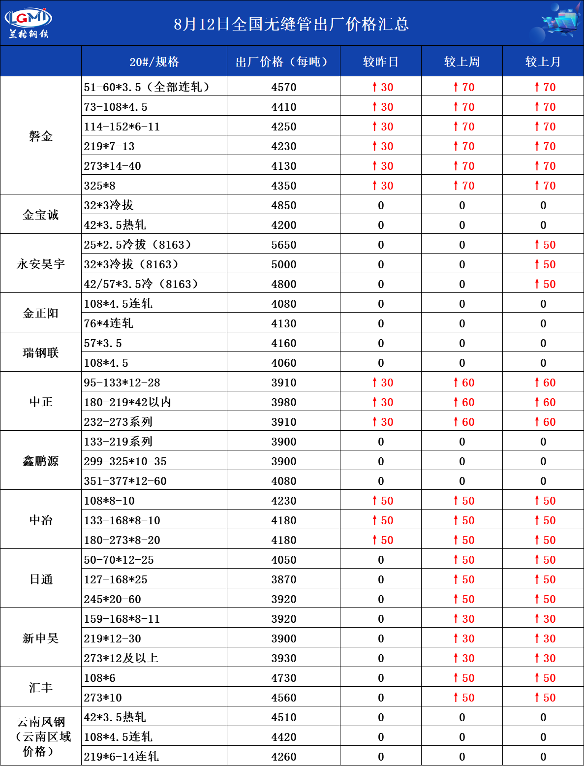 • 8月12日(11:00)主导钢厂20#热轧管坯出厂价