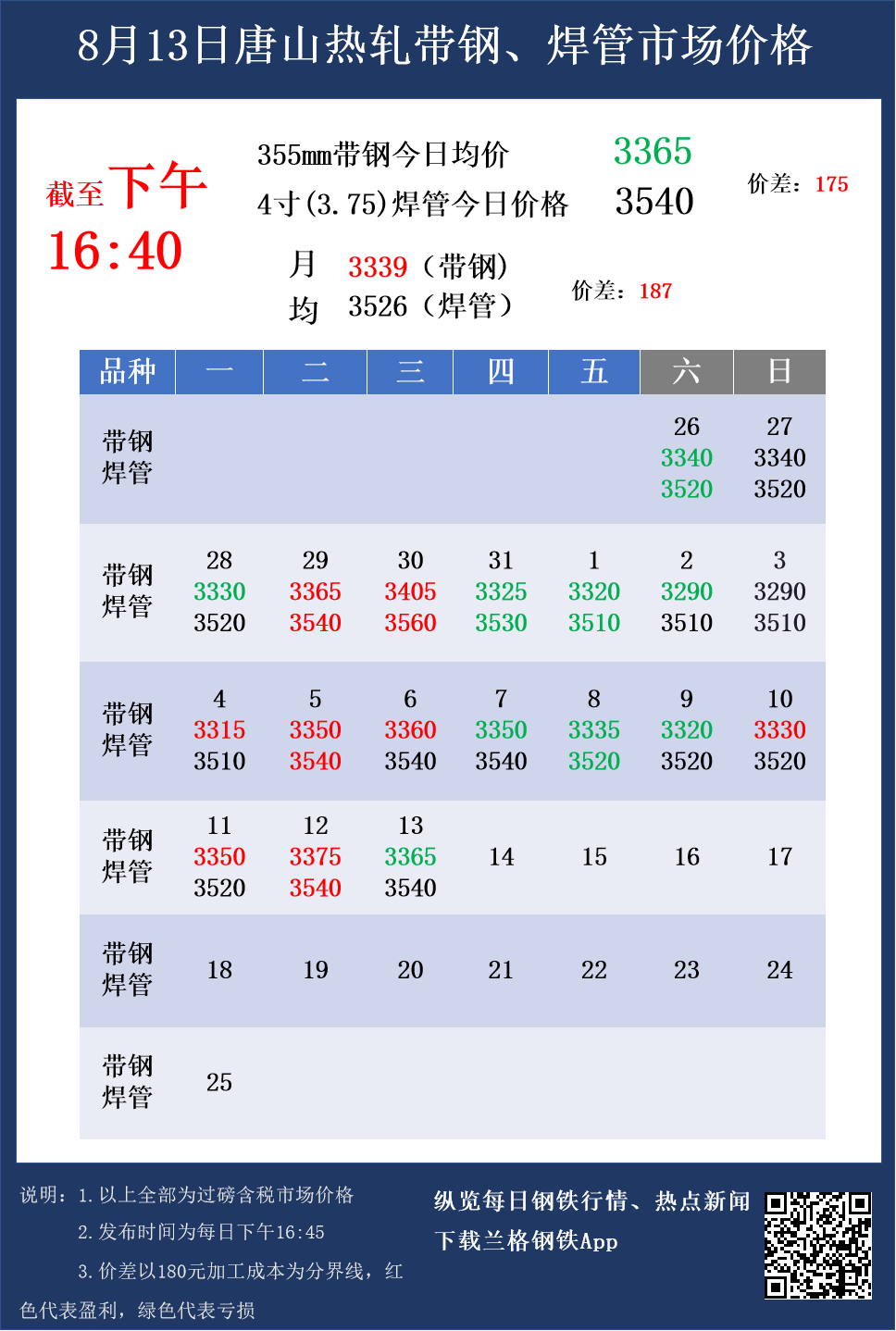 8月13日(16:40)唐山热轧带钢与焊管市场成交价格