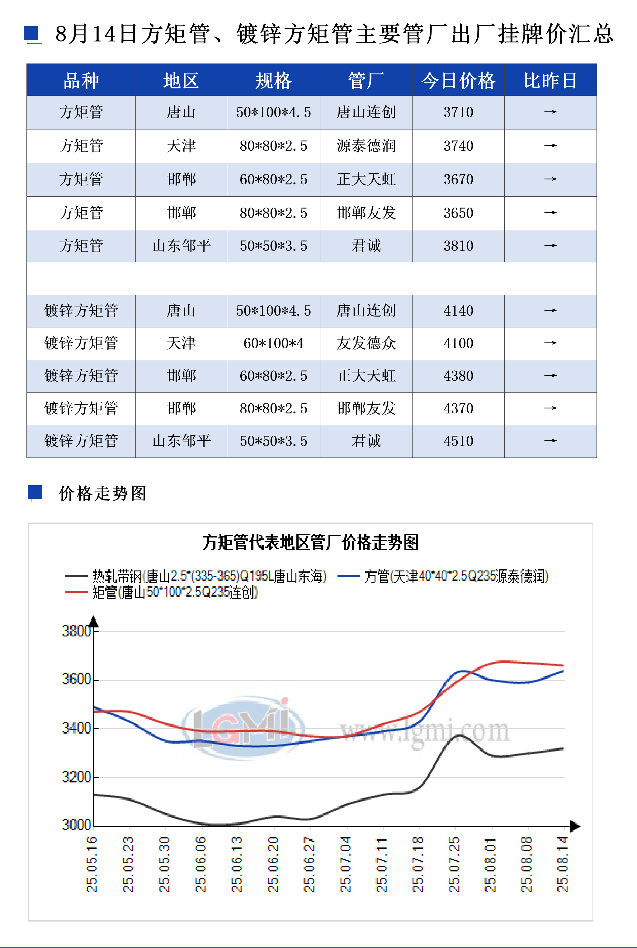 • 8月14日方矩管、镀锌方矩管主要管厂出厂挂牌价汇总