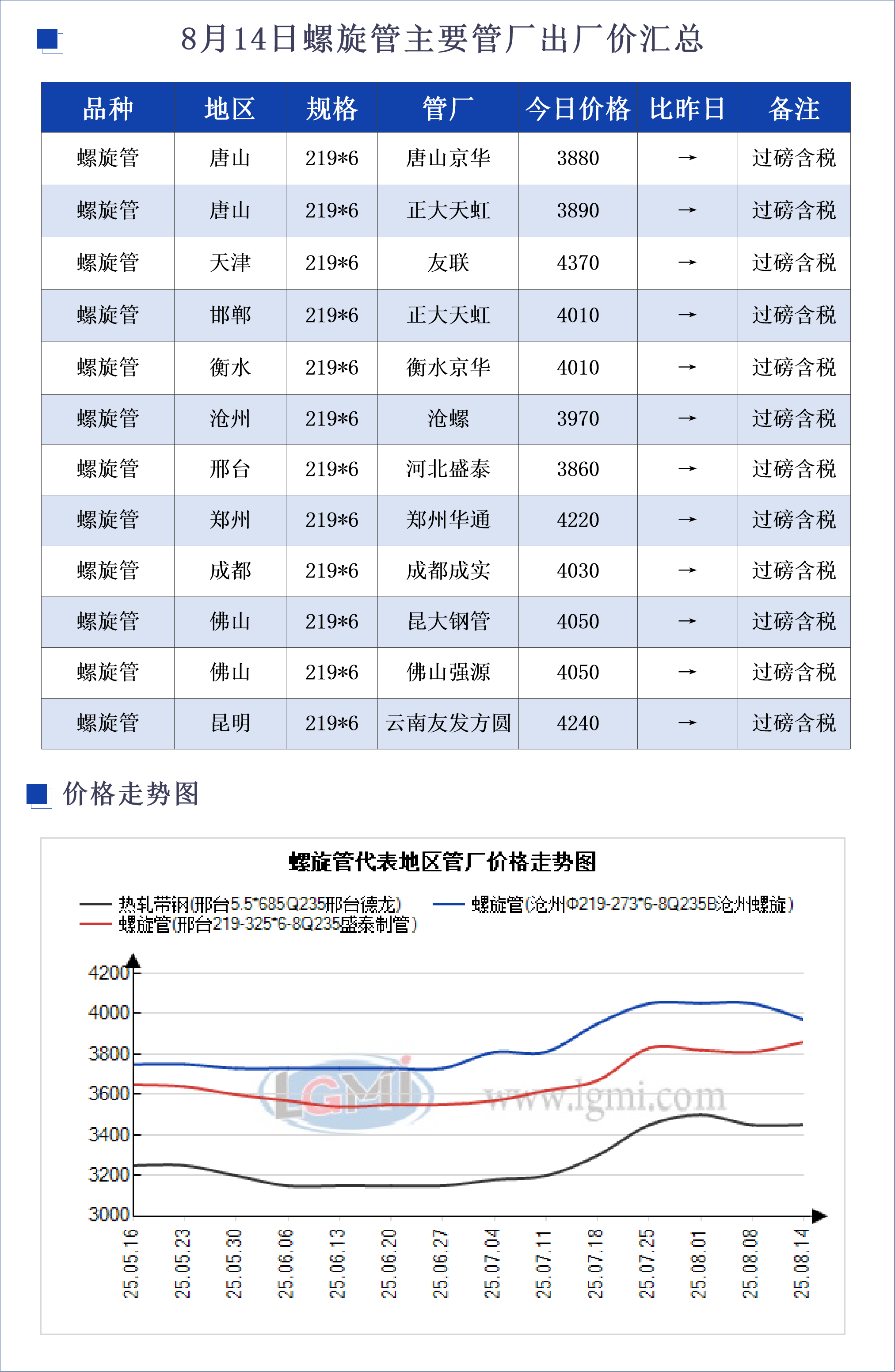 • 8月14日螺旋管主要地区管厂出厂价汇总