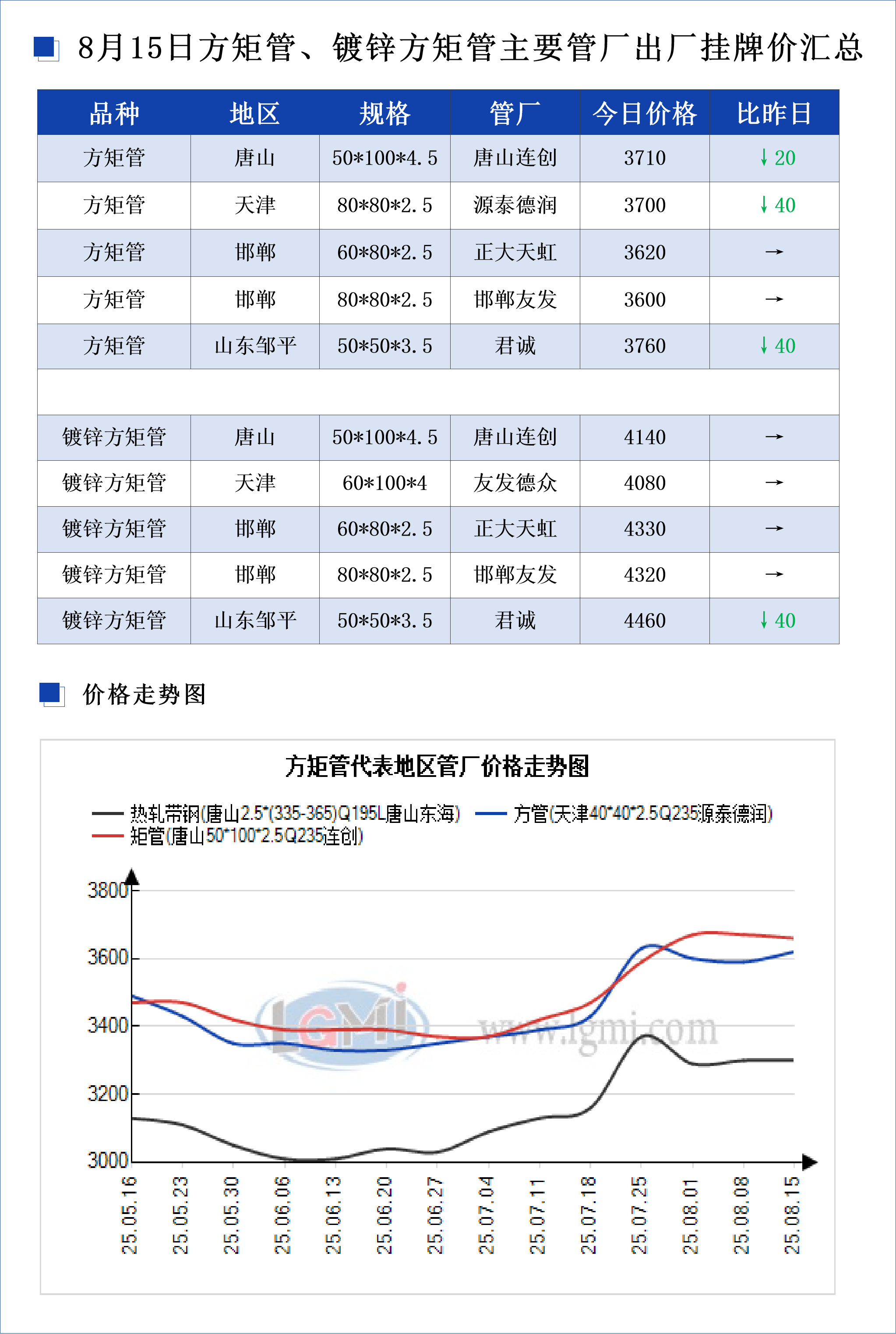 • 8月15日方矩管、镀锌方矩管主要管厂出厂挂牌价汇总