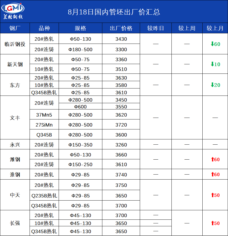 • 8月18日(11:00)主导钢厂20#热轧管坯出厂价