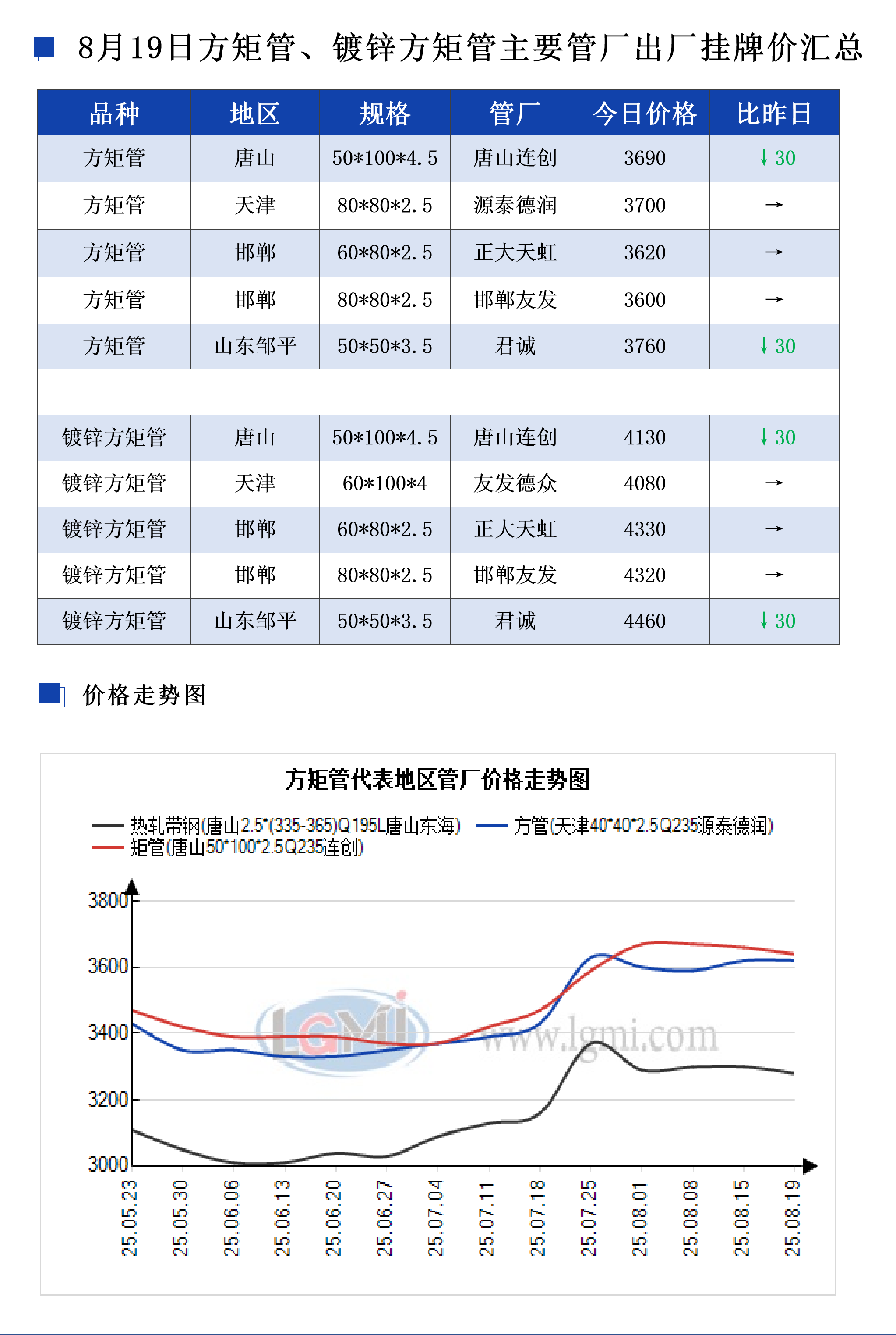 • 8月19日方矩管、镀锌方矩管主要管厂出厂挂牌价汇总
