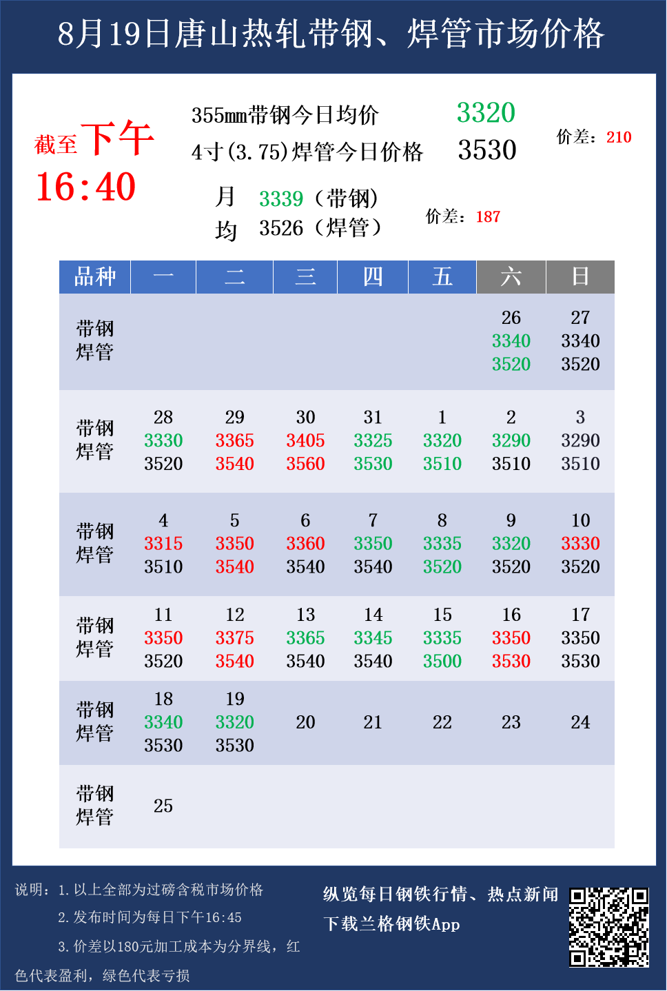 • 8月19日(16:40)唐山热轧带钢与焊管市场成交价格