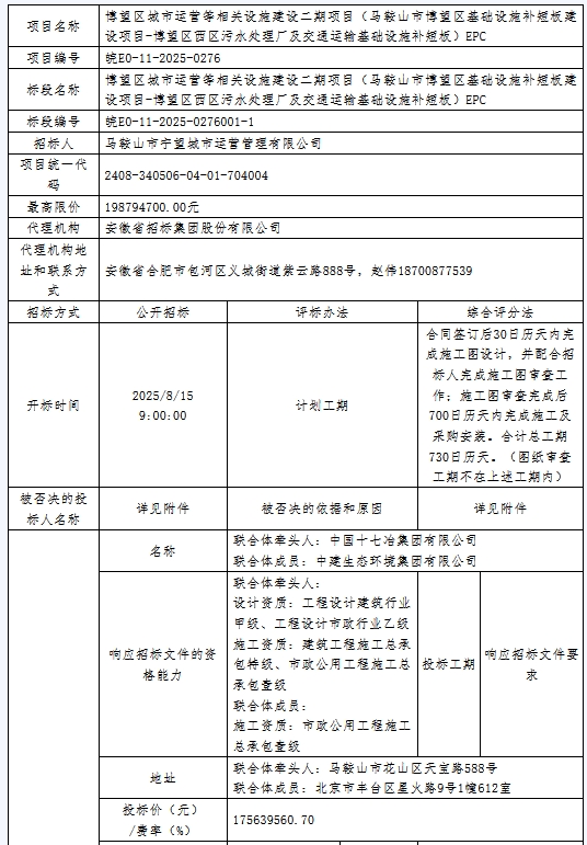 安徽马鞍山博望区西区污水处理厂及交通运输基础设施补短板EPC定标候选人公示