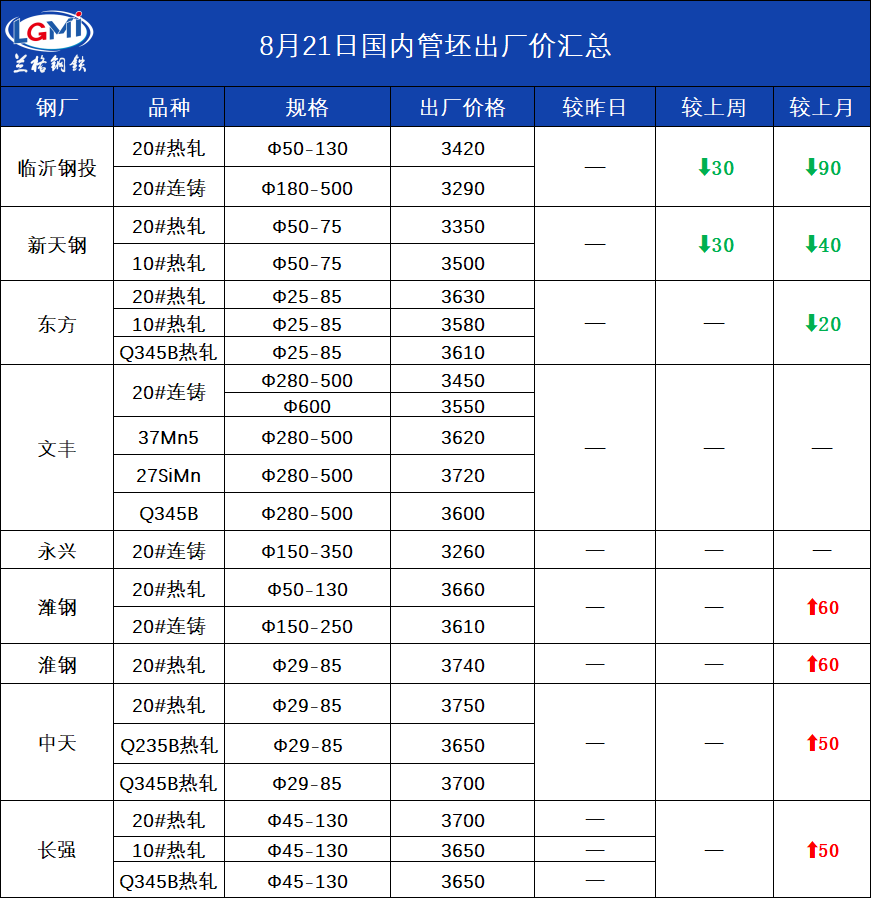 • 8月21日(11:00)主导钢厂20#热轧管坯出厂价