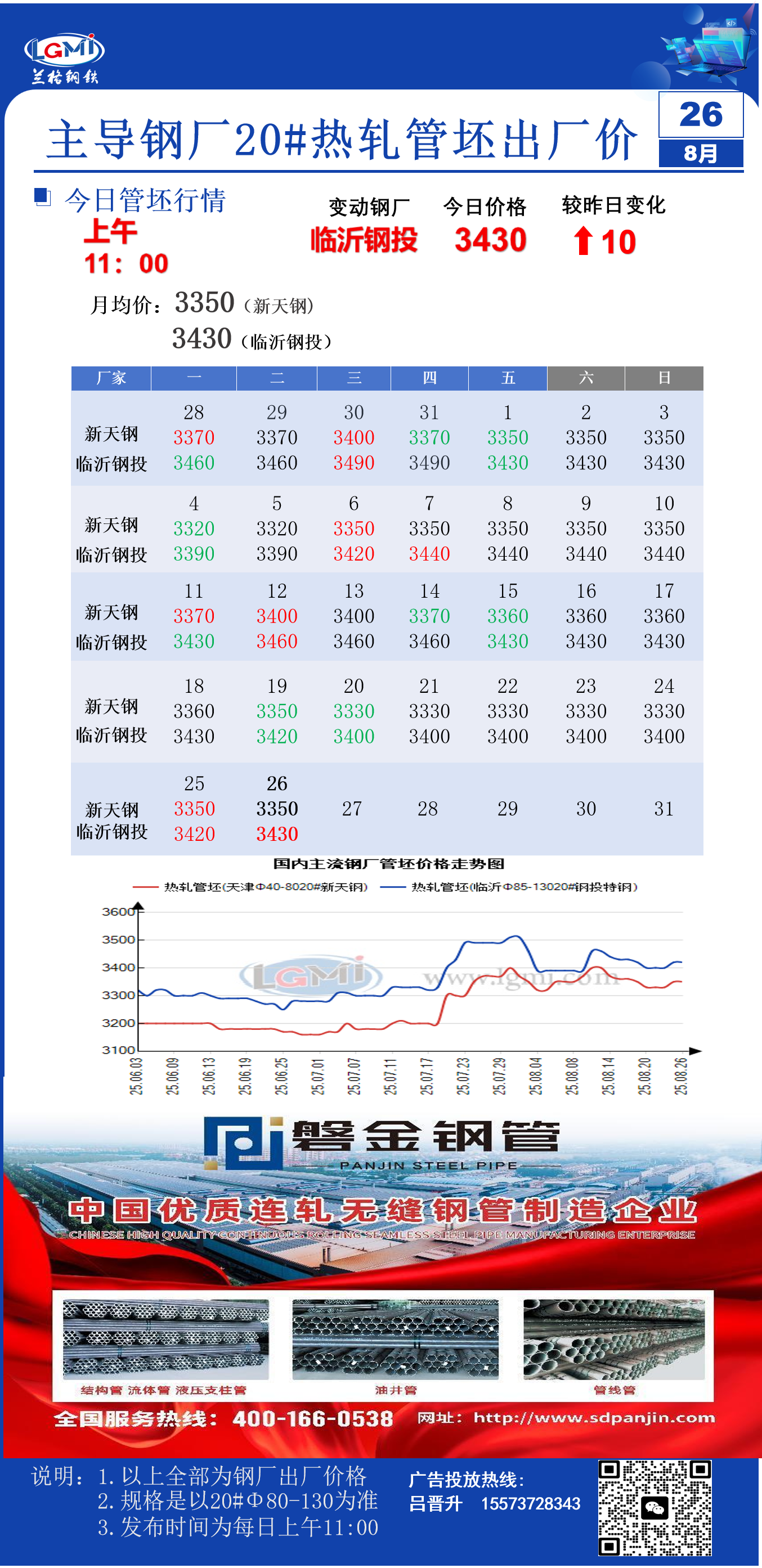 • 8月25日(11:00)主导钢厂20#热轧管坯出厂价