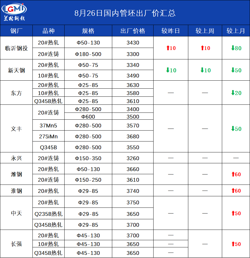 • 8月26日(11:00)主导钢厂20#热轧管坯出厂价