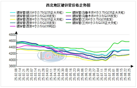 八月份,西北焊接钢管市场价格整体震荡运行,同比上月成交明显减少。兰格钢铁云商平台监测数据显示,截至8月26日,焊管4寸(3.75mm)过磅含税价格:西安地区:友发报3640元(吨价,下同),正大报3640元,月环比涨90元;兰州地区:正大报3700元,环比涨20元;银川地区:正大报3700元,环比跌20元;乌鲁木齐地区:八钢报4110元,正大报3980元,环比跌10元。镀锌管4寸(3.75mm)过磅含税价格:西安地区:利达报4180元,友发报4180元,正大报4160元,环比持平;兰州地区:友发报4300元,正大报4320元,环比涨20元;银川地区:友发报4300元,正大报4320元,环比涨60元;乌鲁木齐地区:友发报4600元,正大报4600元,环比涨70元。