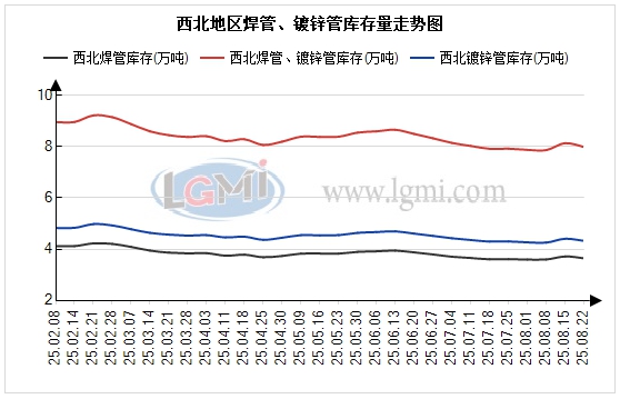 八月份西北地区管材库存整体先增库后减库。前期因有政策的强预期,管厂和贸易商沟通后期会涨价,让贸易商这段时间尽快补库,贸易商均有响应补库存,且有强预期刺激终端释放需求,消化库存加快。月后期,炒作预期情绪已然降温,但前期价格上涨贸易商乘机大量抛售,且未有大量补库,西北管材市场和管厂库存极低,低供应和低库存缓解了市场一定的焦虑情绪。据兰格钢铁网统计,截至8月20日,西北地区镀锌管、焊管主导城市库存总量7.98万吨,月同比-1.85%,季同比0.88%,年同比-25.08%。