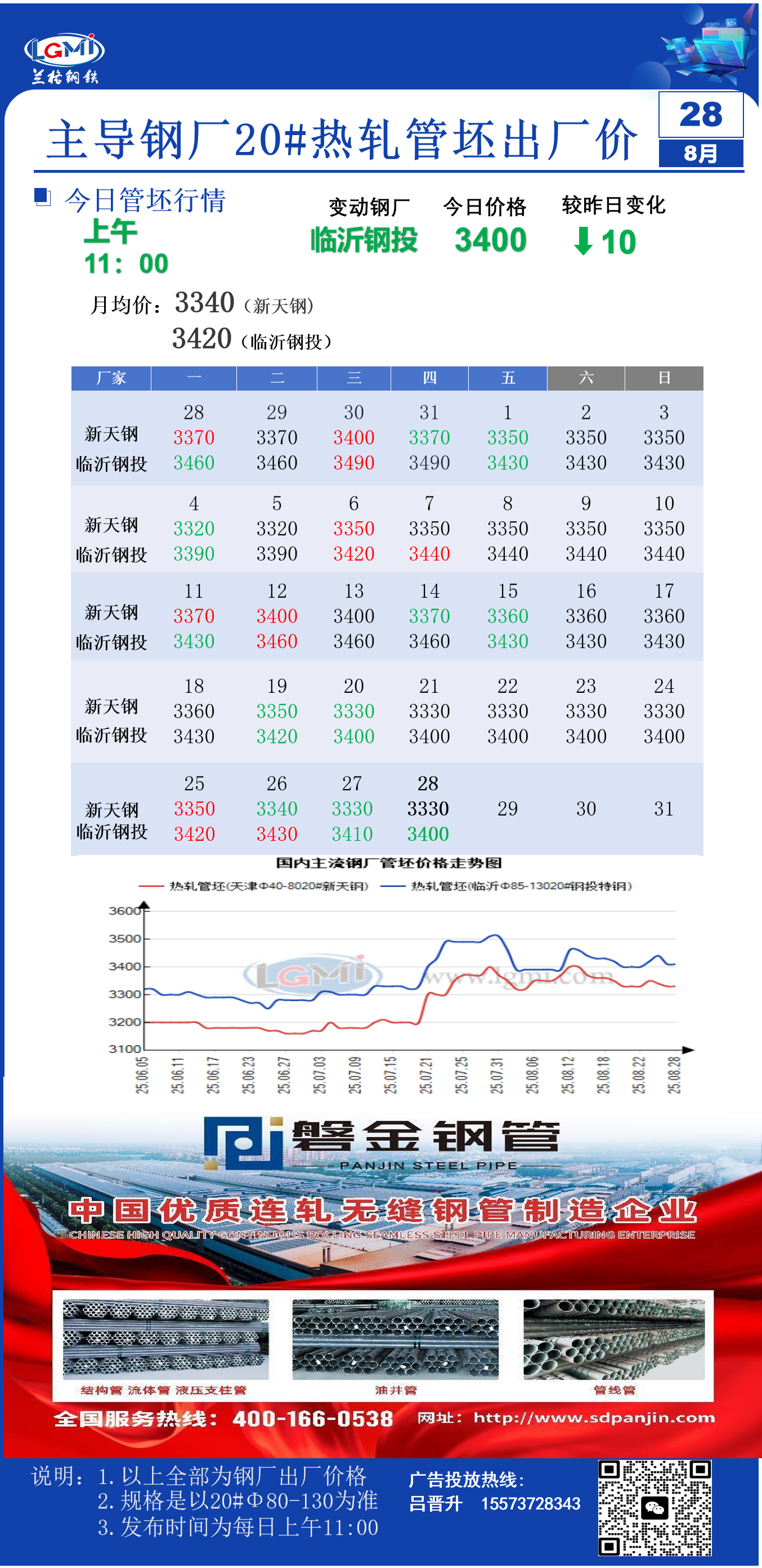 • 8月28日(11:00)主导钢厂20#热轧管坯出厂价