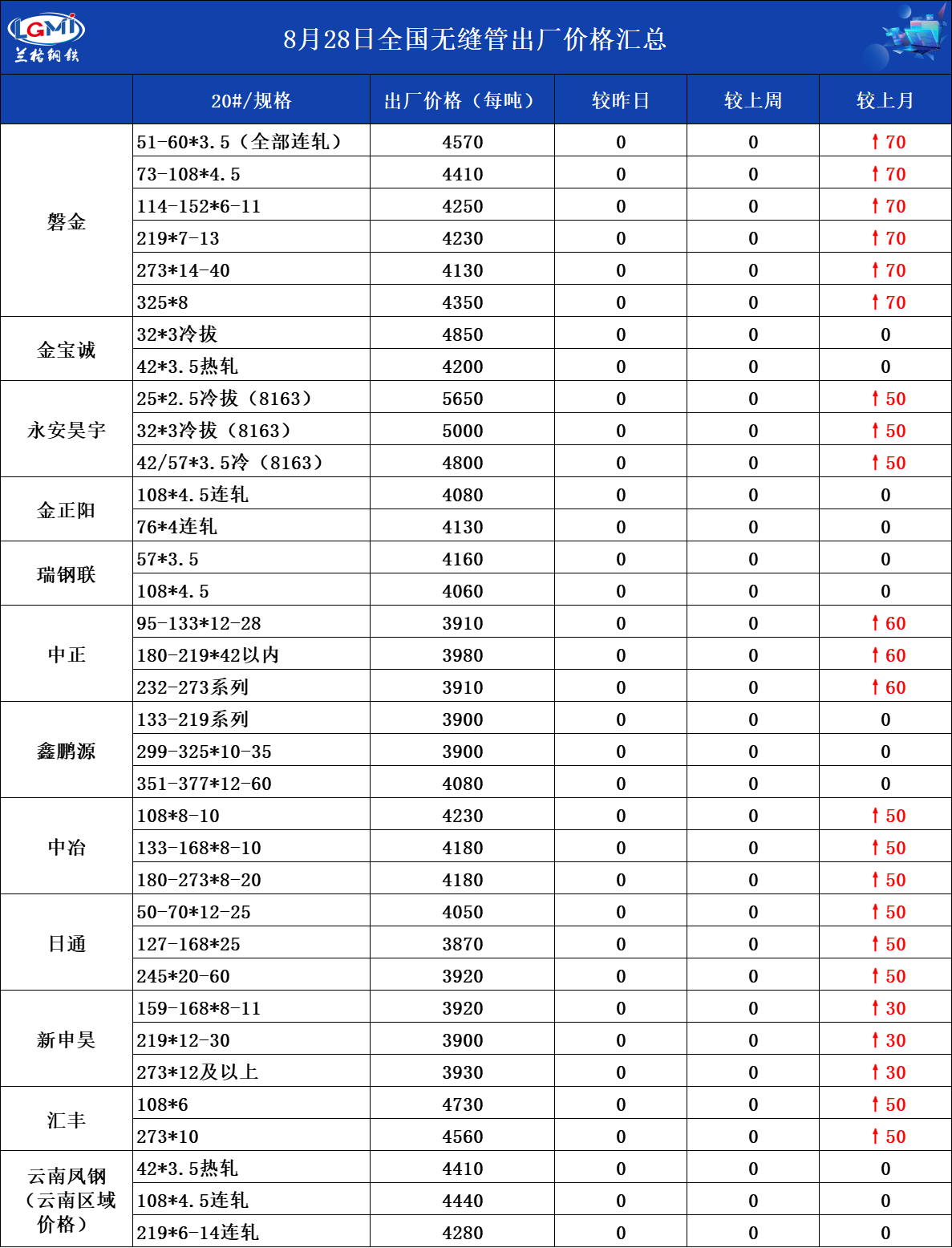 • 8月20日全国无缝管出厂价格汇总