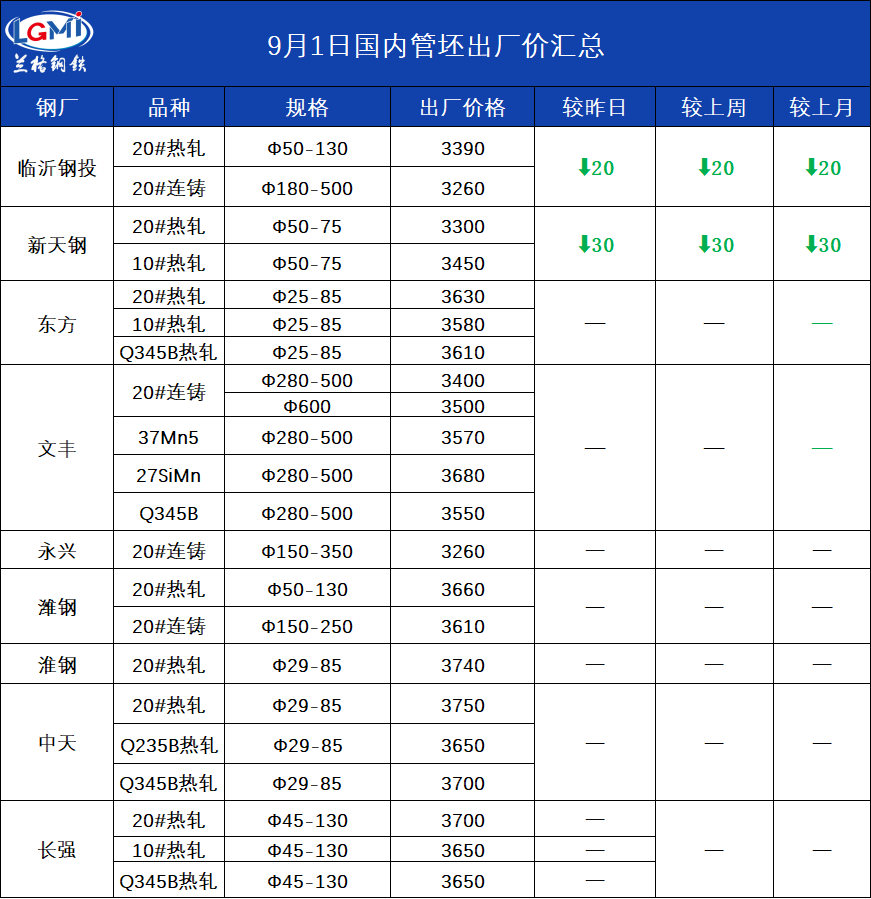 • 9月1日(11:00)主导钢厂20#热轧管坯出厂价
