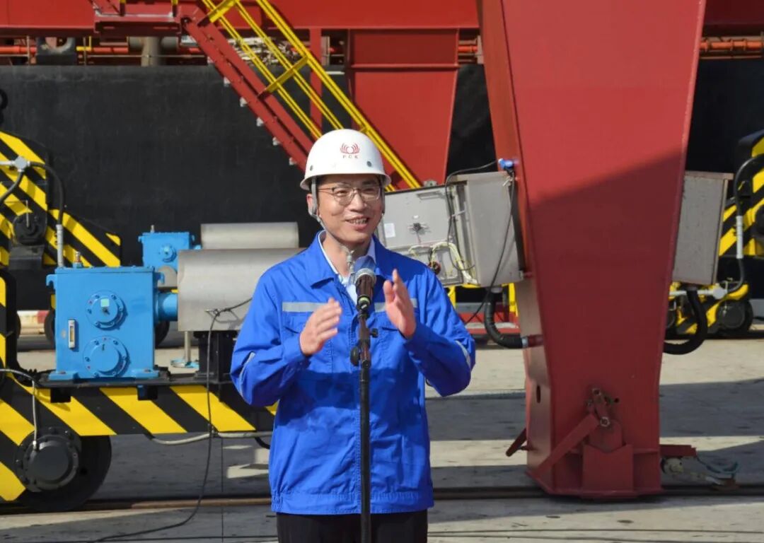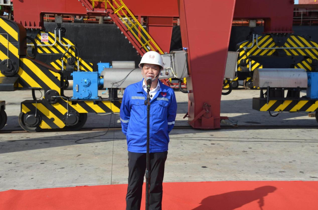 受集团董事会陈主席委托,集团总经理但昭学代表董事会向道达尔公司、监理单位、地方政府、徐圩港口及各合作单位的鼎力支持致以诚挚感谢,同时向珠海基地、连云港基地为项目辛勤付出的全体同事表示敬意。随后,但昭学总经理宣布珠江钢管道达尔EACOP项目钢管最终交付正式启动,并预祝交付圆满成功。