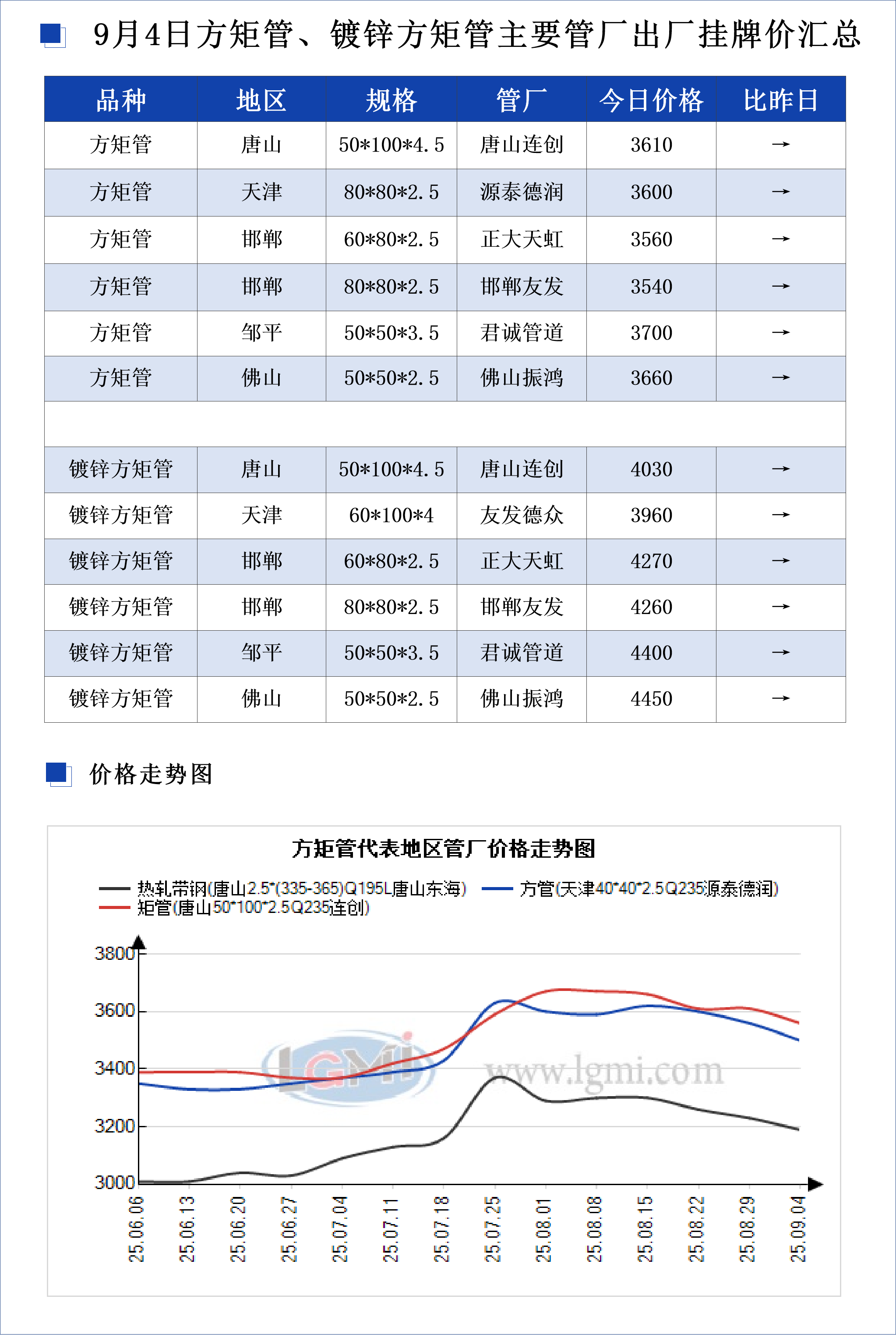 • 9月4日方矩管、镀锌方矩管主要管厂出厂挂牌价汇总