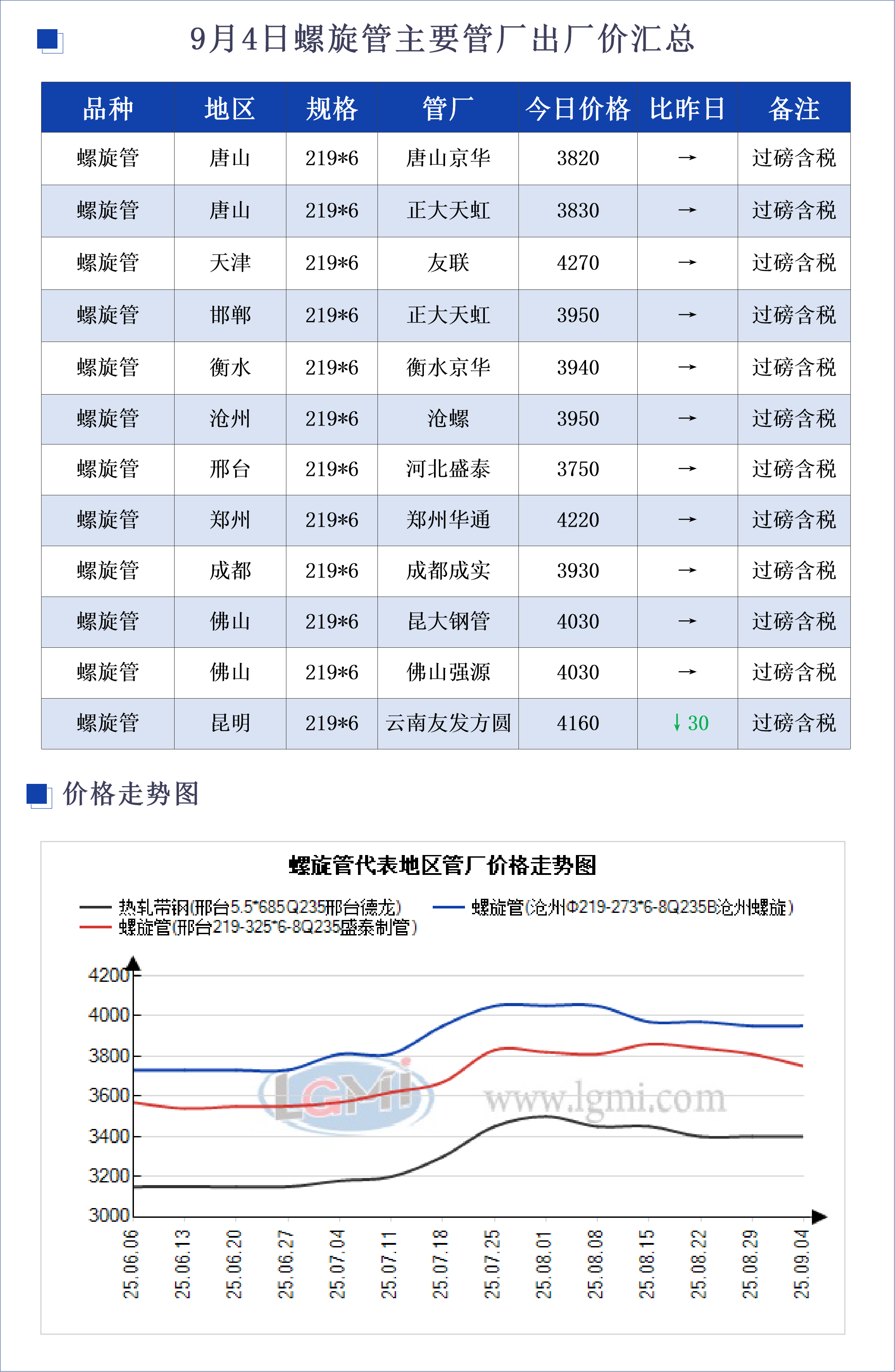 • 9月4日螺旋管主要地区管厂出厂价汇总